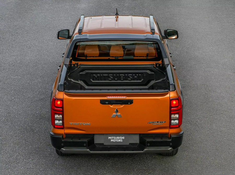 So với phiên bản tiêu chuẩn, Triton Athlete có khá nhiều khác biệt. Đầu tiên, ngoại thất và nội thất dùng tông màu cam chủ đạo phối màu đen làm điểm nhấn. Ngoại thất có vòm bánh, gương chiếu hậu, giá nóc và các đường viền đều màu đen. Cản trước và cản sau màu xám khói.