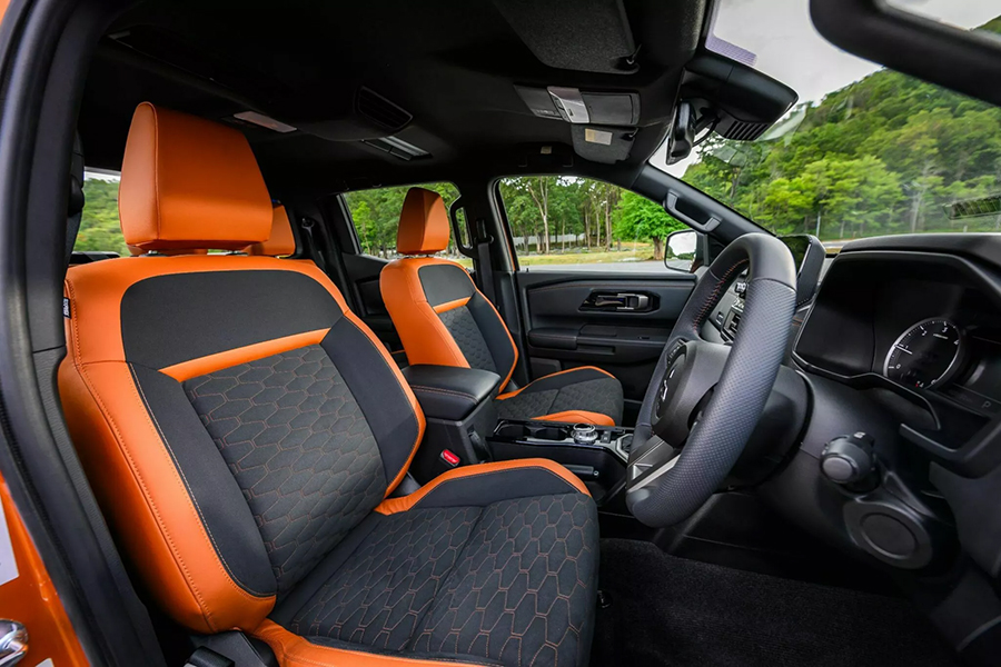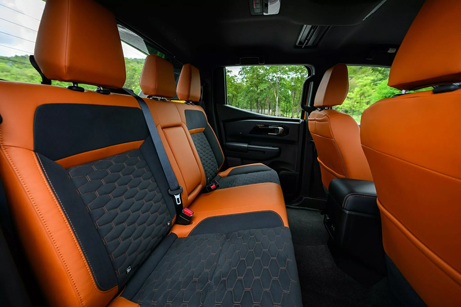 Trong khi đó, cabin xe dùng vải xen lẫn da lộn bọc và da nhân tạo màu cam bên dưới còn trần xe bọc vải đen. Những khu vực dùng da đen bọc được khâu chỉ cam tương phản.