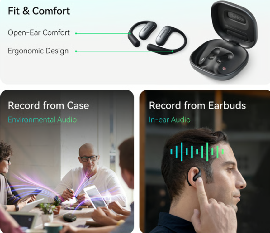 Khi đeo trên tai, TicNote Pods có thể ghi lại các cuộc trò chuyện trực tiếp, họp trực tuyến, cuộc gọi điện thoại, phỏng vấn và bài giảng. Ngoài ra, hộp sạc của thiết bị còn có thể hoạt động như một máy ghi âm độc lập khi đặt trên bàn, phù hợp cho các buổi họp nhóm, thảo luận hoặc hội thảo.