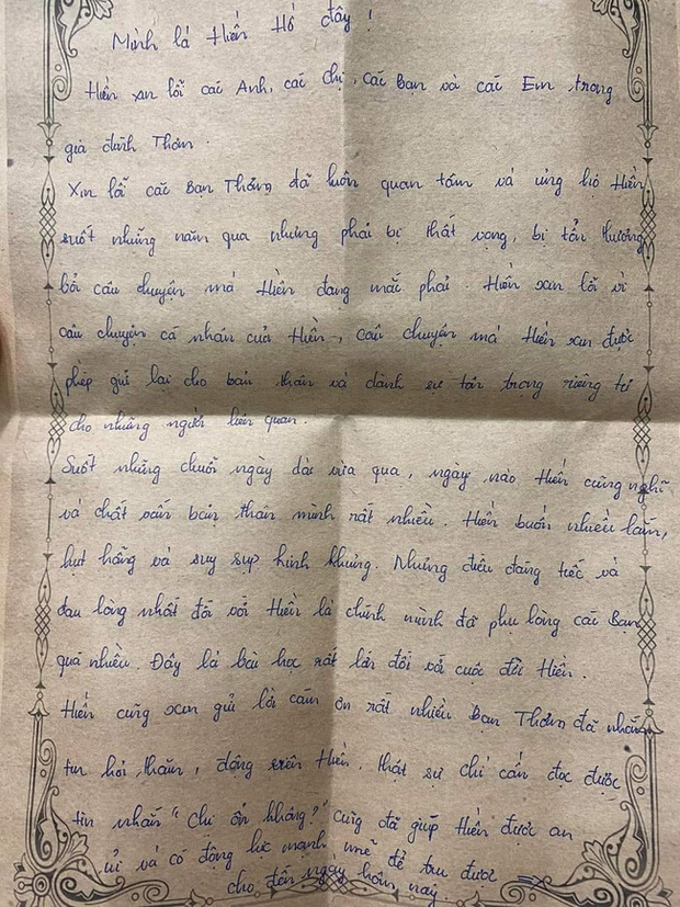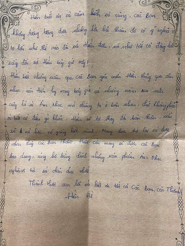Theo nội dung bức thư được chia sẻ, giọng ca "Gặp nhưng không ở lại" gửi lời xin lỗi vì đã khiến người hâm mộ thất vọng. "Mình là Hiền Hồ đây. Hiền xin lỗi các anh, các chị, các bạn và các em trong gia đình Thơm. Xin lỗi các bạn Thơm đã luôn quan tâm ủng hộ Hiền trong suốt thời gian qua nhưng phải bị thất vọng, bị tổn thương bởi câu chuyện mà Hiền đang mắc phải. Hiền xin lỗi vì câu chuyện cá nhân của Hiền. Câu chuyện mà Hiền xin phép được giữ cho bản thân và dành sự tôn trọng riêng tư cho những người liên quan....".