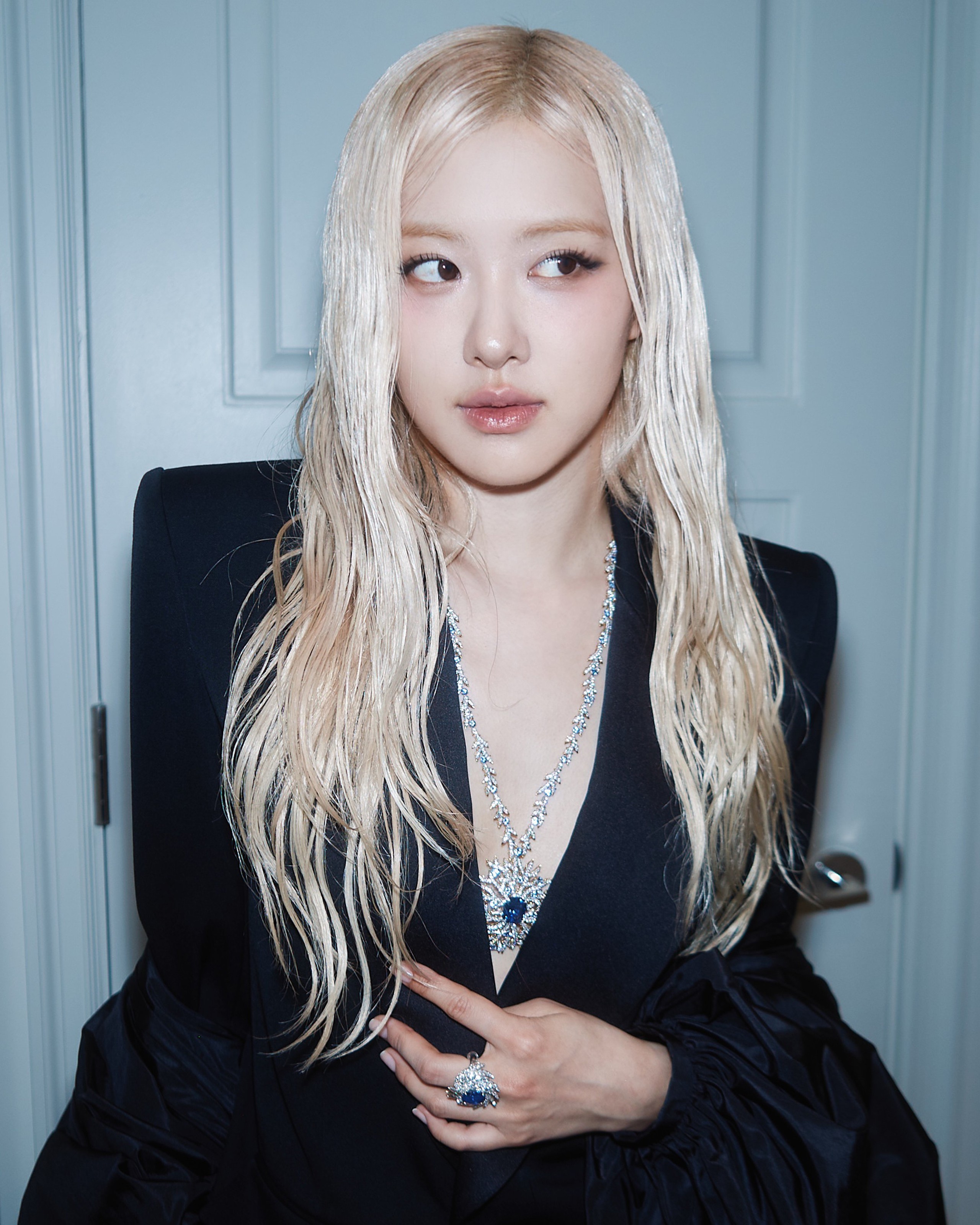 Hoàn thiện vẻ ngoài có phần quá đỗi... trống trải của Rosé là chiếc vòng cổ statement Tiffany & Co.; mẫu trang sức vô cùng ấn tượng làm bằng bạch kim và vàng 18K cao cấp với viên sapphire xanh nằm ở trung tâm, đồng điệu với mẫu nhẫn cùng ngôn ngữ thiết kế trên tay.