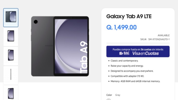 Giá phiên bản LTE của Galaxy Tab A9 tại Samsung Guatemala.