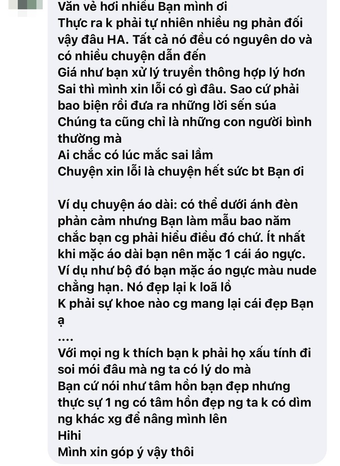 Ví dụ chuyện áo dài, có thể dưới ánh đèn phản cảm nhưng bạn làm mẫu bao năm chắc bạn cũng phải hiểu điều đó chứ. Ít nhất khi mặc áo dài bạn nên mặc 1 cái áo ngực. Ví dụ như bộ đó bạn mặc áo ngực màu nude chẳng hạn. Nó đẹp lại không loã lồ. Không phải sự khoe nào cũng mang lại cái đẹp bạn ạ. Với mọi người không thích bạn không phải họ xấu tính đi soi mói đâu mà người ta có lý do mà.