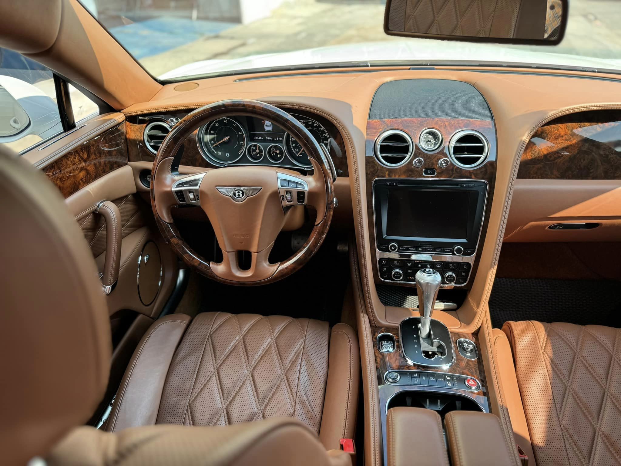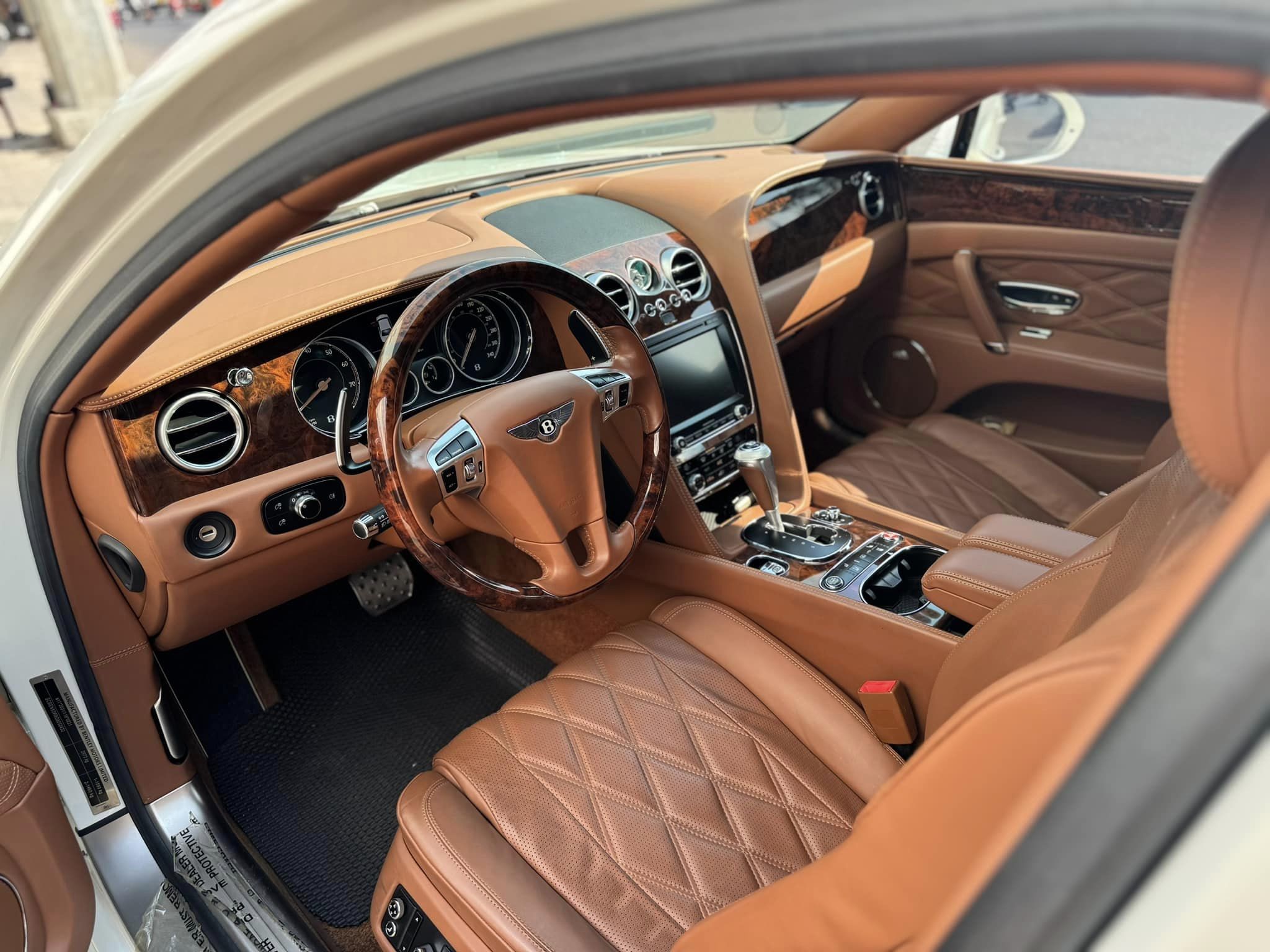 Bên trong cabin, chiếc Bentley Flying Spur sử dụng tông màu nâu da bò chủ đạo, xen kẽ là các đường chỉ khâu hình kim cương tạo sự sang trọng. Nhìn chung, tình trạng da ghế ở mức khá, chưa xuất hiện nhiều vết nhăn, vẫn có độ căng. Có thể nói, chủ nhân tiếp theo sẽ không cần quá lo lắng về chất lượng ở cả trong và ngoài xe.