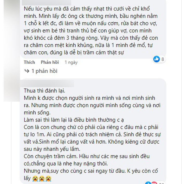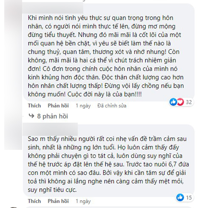 "Hôm nay đọc tin về người mẹ bị trầm cảm sau sinh, tự nhiên càng thấy thương phụ nữ quá. Lấy chồng như đánh 1 canh bạc, đến sau sinh nở mới biết mình đã thắng hay thua… Mình chưa trầm cảm, nhưng mình cũng thấy cô đơn và tuyệt vọng quá!
