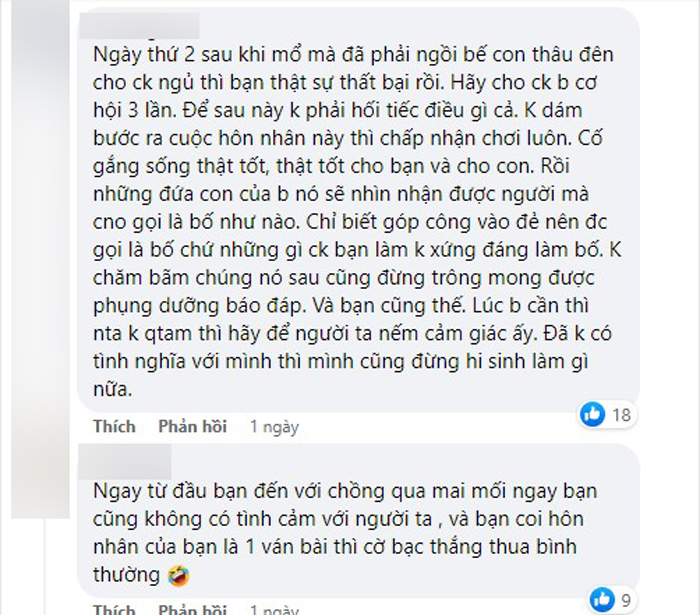 Không ít người phụ nữ kết hôn, sinh con xong gặp phải hoàn cảnh tương tự, nên bài viết của người vợ trẻ này đã nhận được rất nhiều đồng cảm. Có lẽ ngay từ đầu sự lựa chọn của chị đã là tạm bợ, nên mới dẫn đến kết quả hôm nay. Tuy nhiên cuộc đời phía trước còn rất dài, con người không thể mãi sống cam chịu và nhẫn nhịn cầu toàn như thế. Chị còn trẻ, chị còn cơ hội thay đổi, cải biến, thậm chí là "chọn lại" nếu như chị đủ mạnh mẽ và quyết tâm.