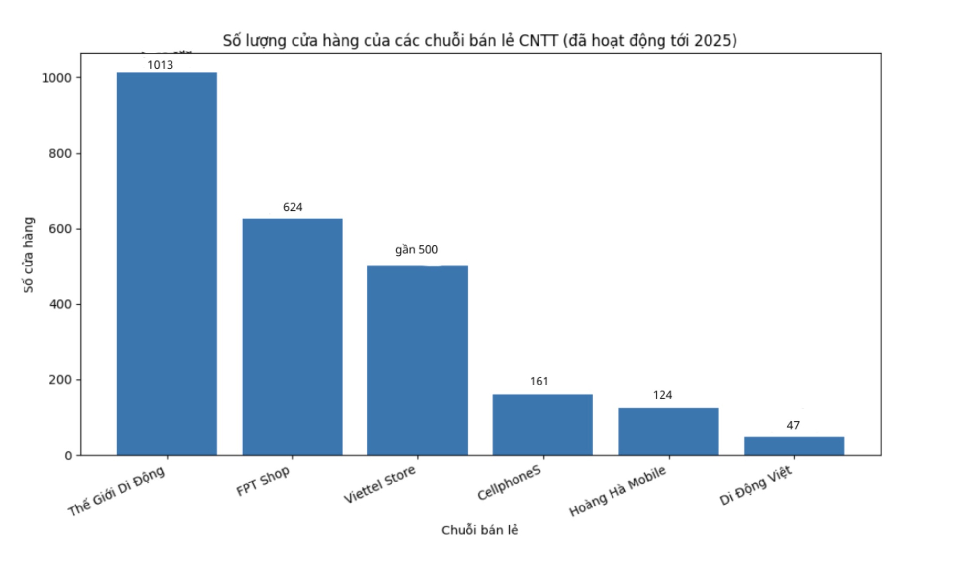 Thị trường bán lẻ CNTT, điện máy và smartphone tại Việt Nam hiện có sự tham gia của nhiều chuỗi lớn với quy mô mạng lưới cửa hàng khác nhau. Xét theo số lượng điểm bán đang hoạt động, Thế Giới Di Động và FPT Shop tiếp tục là hai chuỗi dẫn đầu, trong khi vị trí tiếp theo ghi nhận sự hiện diện đáng kể của Viettel Store.