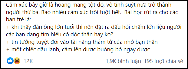 - Đọc đoạn yêu người đàn ông 39 tuổi độc thân lại còn làm tiếp viên là thấy có điềm rồi. Đến đoạn bảo xin mỗi số điện thoại, không đưa mạng xã hội là hiểu chắc chắn có vấn đề. Đọc đến đoạn cuối cũng k còn bất ngờ lắm. Lạ gì nữa.