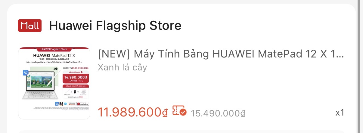 Trên Shopee, mức giá thực tế cho MatePad 12 X từ ngày 10 đến 15/1 giảm còn khoảng 11,9 triệu đồng khi cộng dồn mã giảm giá, giúp tổng chi phí thấp hơn vài triệu so với niêm yết. Đây là mức giá thấp hơn cả ưu đãi mở bán trước đó vốn giảm 500 nghìn đồng trực tiếp trên máy.