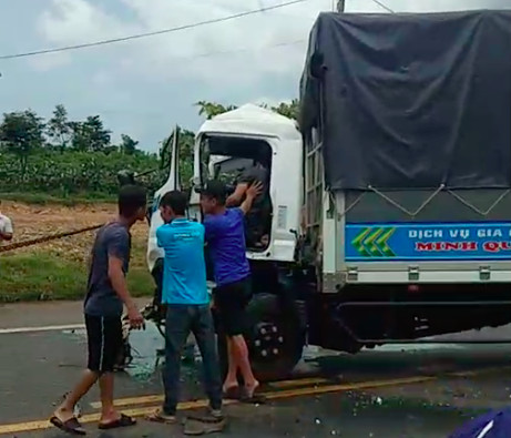 Cú tông mạnh khiến đầu xe tải 48H-011.65 bị bẹp dúm, tài xế Quang và phụ xe là anh Vũ Văn Quân (ngụ huyện Đắk Song, Đắk Nông) bị kẹt trong ca-bin. Ngay sau đó, người dân đã dùng xe kéo, phá ca-bin đưa nạn nhân ra ngoài.