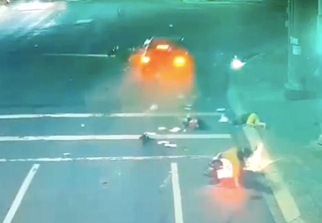 Cú tông mạnh khiến cả người và ba xe máy văng một đoạn xa. Chiếc xe ô tô gây tai nạn vẫn tiếp tục chạy khoảng 30 mét mới dừng lại.