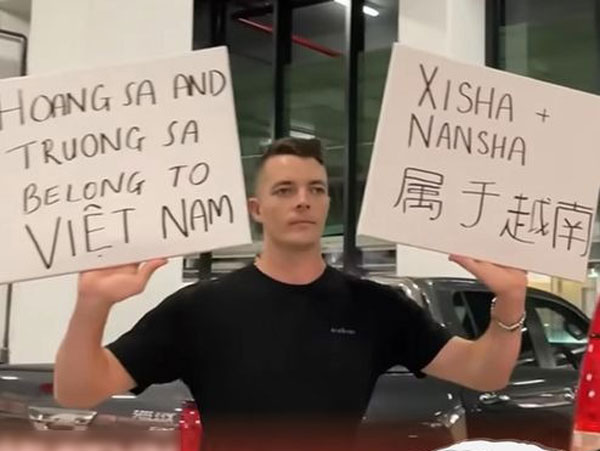 Cụ thể, thanh niên cầm theo 2 tấm bảng ghi to và rõ HOÀNG SA + TRƯỜNG SA LÀ CỦA VIỆT NAM bằng cả tiếng Anh lẫn tiếng Trung rồi đi khắp nơi tại Trung Quốc để phổ cập kiến thức này.