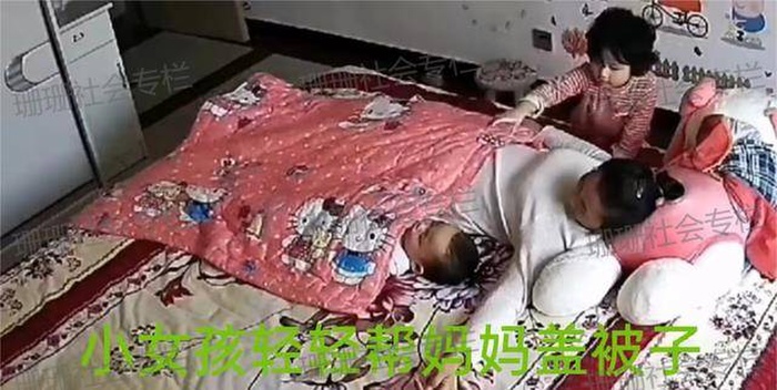Một đoạn video quay lại cảnh bé gái đang đắp chăn cho mẹ và em trai ngủ trưa mới đây đã khiến cư dân mạng xứ Trung xôn xao bàn tán. Câu chuyện diễn ra tại một căn nhà ở Chu Khẩu, Hà Nam, Trung Quốc. Lúc này đang là giữa trưa, một bà mà đang nằm dỗ con trai ngủ, mẹ cũng ngủ thiếp đi lúc nào không hay.