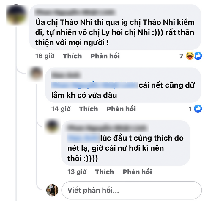 Thí sinh Hoàng Như Mỹ ngồi cạnh Hương Ly nhìn thấy đoạn bình luận và ngay lập tức trả lời "thẳng như ruột ngựa":"Chị Thảo Nhi thì qua Insta của chị Thảo Nhi kiếm, chứ tự nhiên Insta chị Ly mà tìm chị Thảo Nhi?". Hương Ly có vẻ "gánh không nổi pha này" nên cô nàng đọc ngay câu hỏi khác để làm lơ vụ việc.