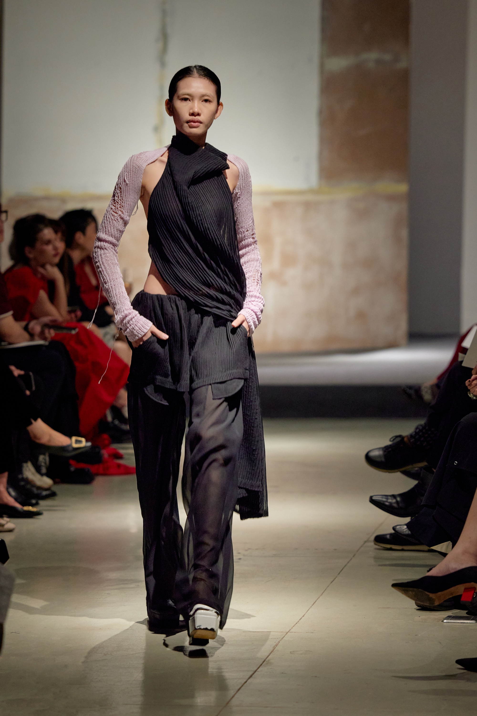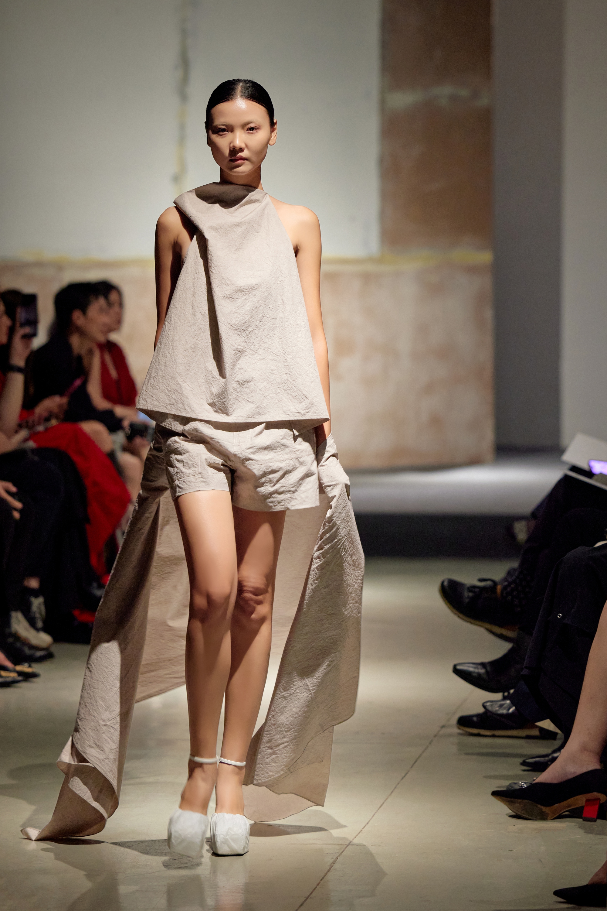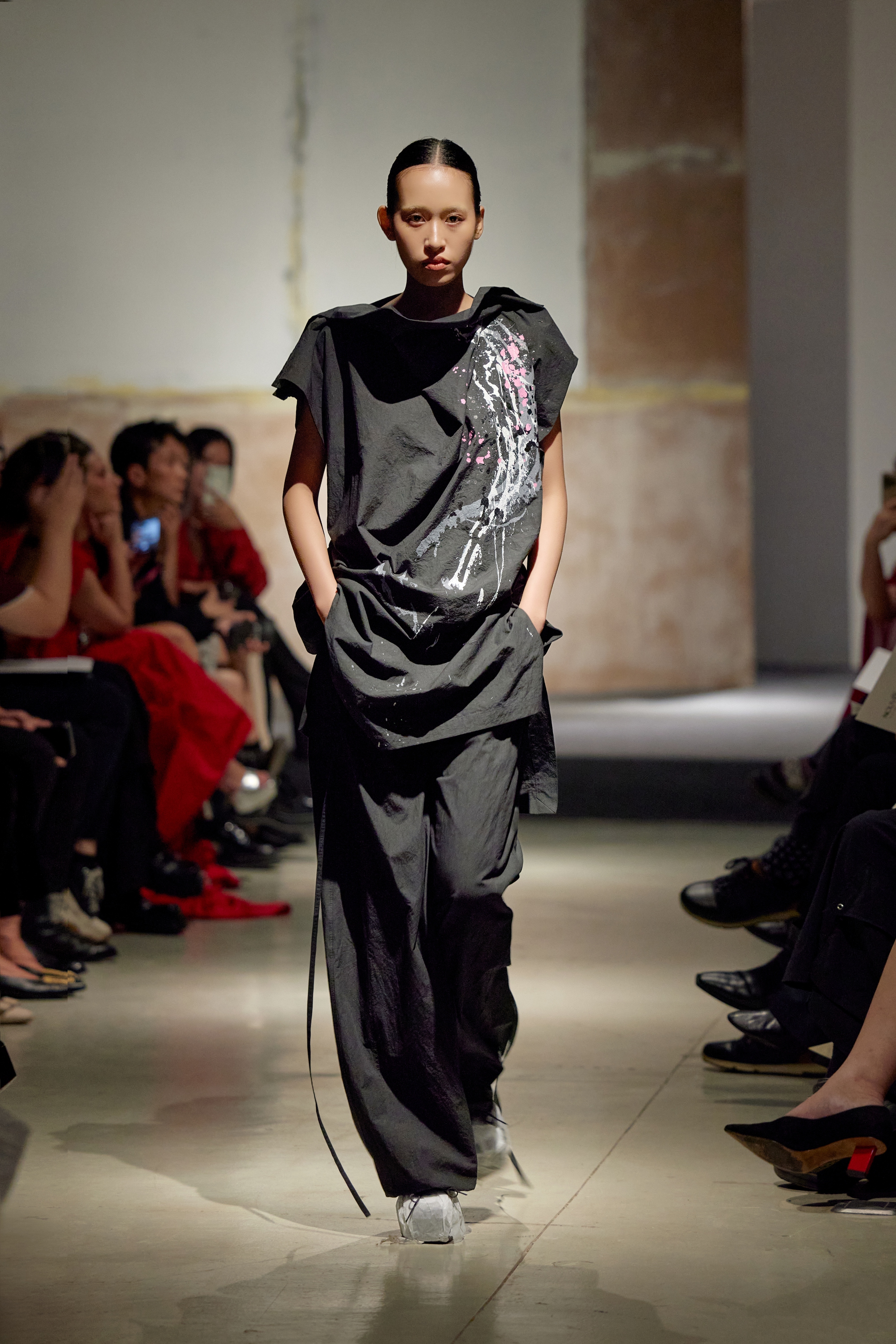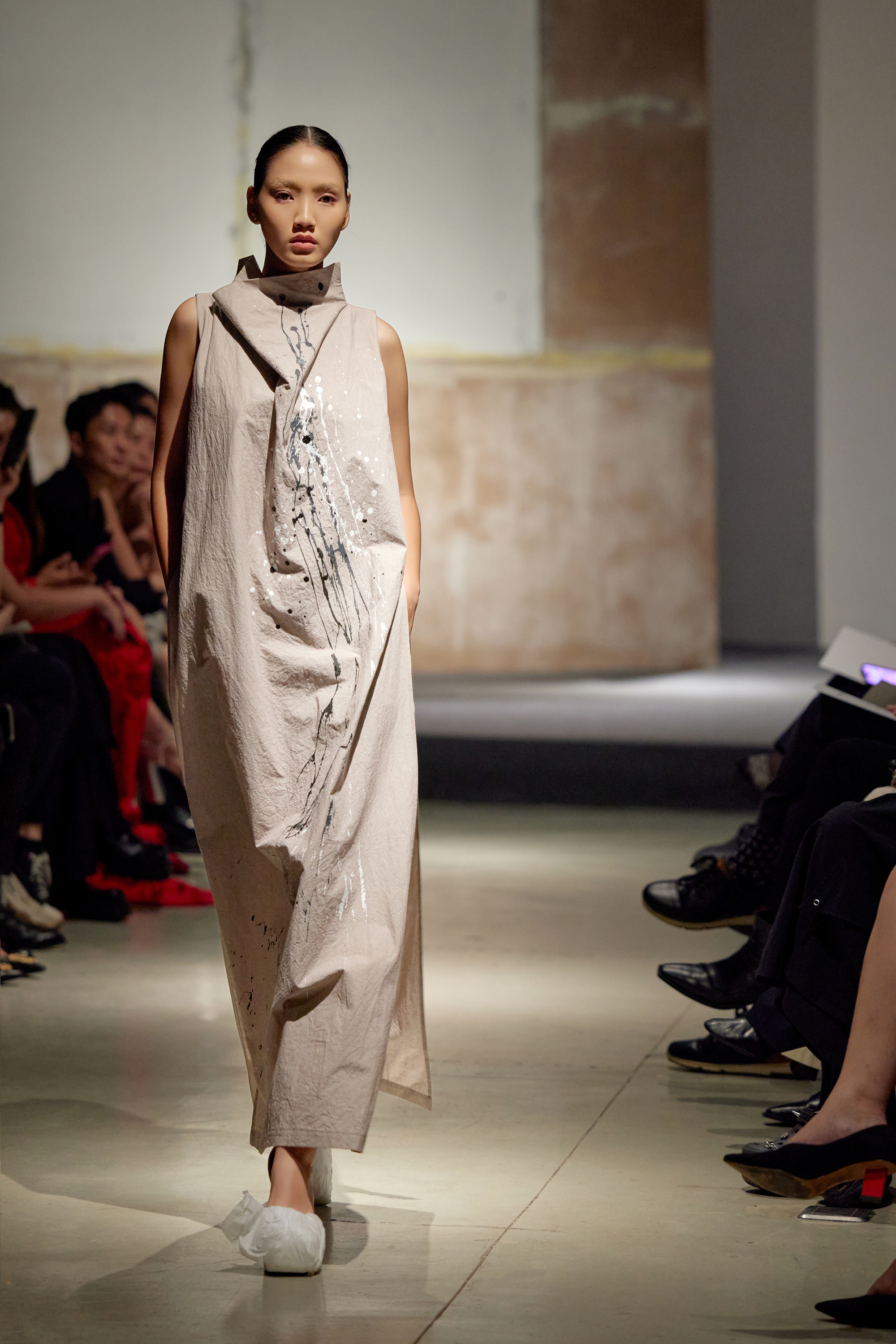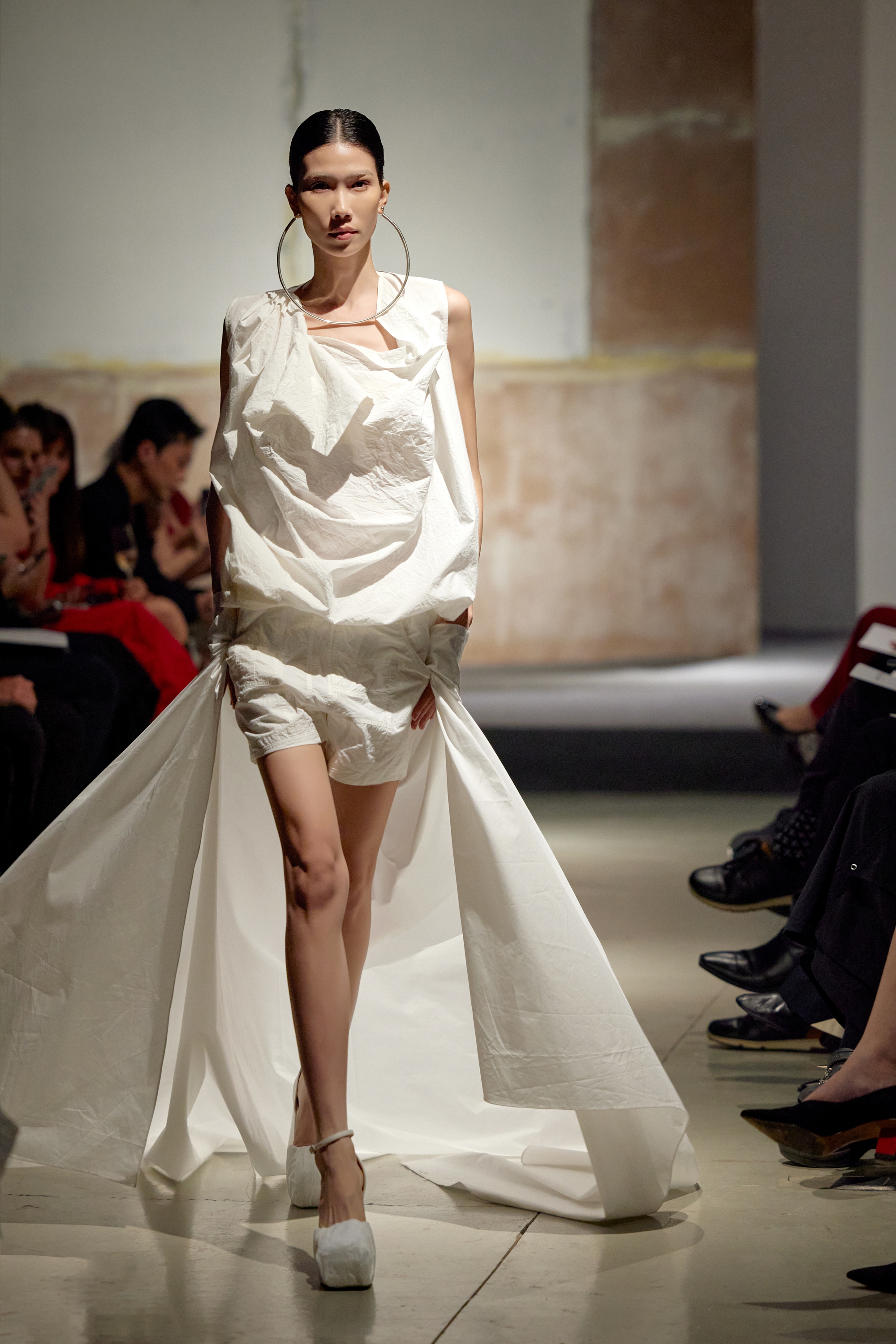 Sáng tạo trên nền chất liệu chủ đạo là tơ tằm 100% từ Việt Nam, Organic Cotton, Washi-Paper (Cotton Giấy). Bảng màu đen, xám ấn tượng phối cùng sự ngọt ngào của hồng và trắng, Nguyễn Hoàng Tú phát triển sở trường quen thuộc theo phong cách dark wear cùng kỹ thuật xử lý rập theo tư duy ngôn ngữ hình học riêng biệt.