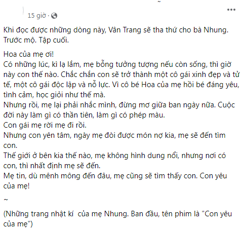 Thành viên ekip cũng úp mở một cái kết bi thảm. Theo đó, khi Trang đọc được những dòng nhật ký này cũng là lúc cô đứng trước mộ của bà Nhung. Lúc này, cô mới quyết định tha thứ cho mẹ khi tất cả đã muộn màng.