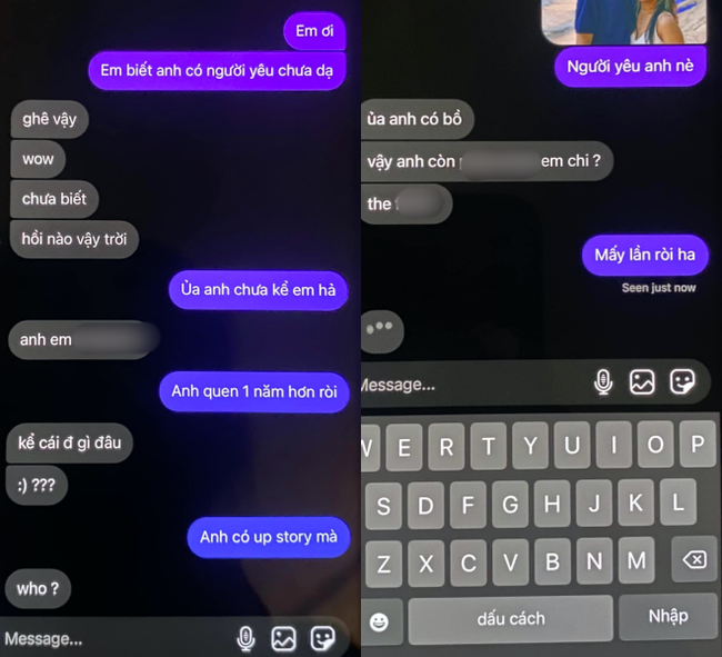 - Ủa anh có bồ mà anh còn 'lên giường' với em làm chi", đây là đoạn tin nhắn cô bạn gái lấy máy của A. nhắn cho kẻ thứ ba.