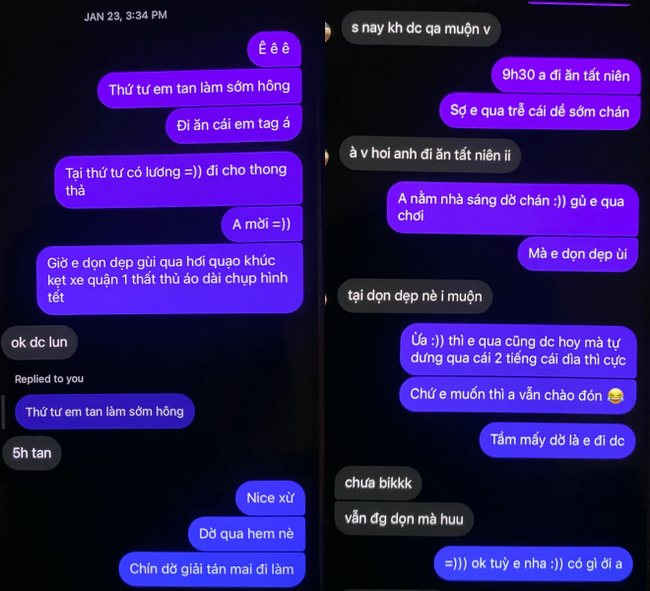 Đằng sau là hàng loạt tin nhắn của A. nhắn cho người tình. Toàn là chuyện hẹn hò đi chơi, mời đi ăn hay thậm chí rủ về nhà chơi. Thậm chí khi cô và A. đang đi du lịch, anh ta cũng nhắn tin để tán tỉnh, gạ gẫm cô gái khác.