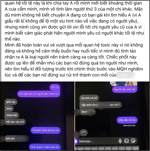 Cô vạch trần tiếp: "Hóa ra mình đã nhầm, A. quen cô bạn đó từ năm 2020 chứ không phải từ tháng 8 lúc chia tay mình. Điều khiến mình không còn lưu luyến mối tình tồi tệ này là mình phát hiện ra khi anh ta đang cưa cẩm mình, mình vô tình làm người thứ 3 của một chị khác. Mặc dù mình hoàn toàn không biết lúc đó A. đã có bạn gái nhưng mình cũng xin gửi lời xin lỗi tới người yêu cũ của A".
