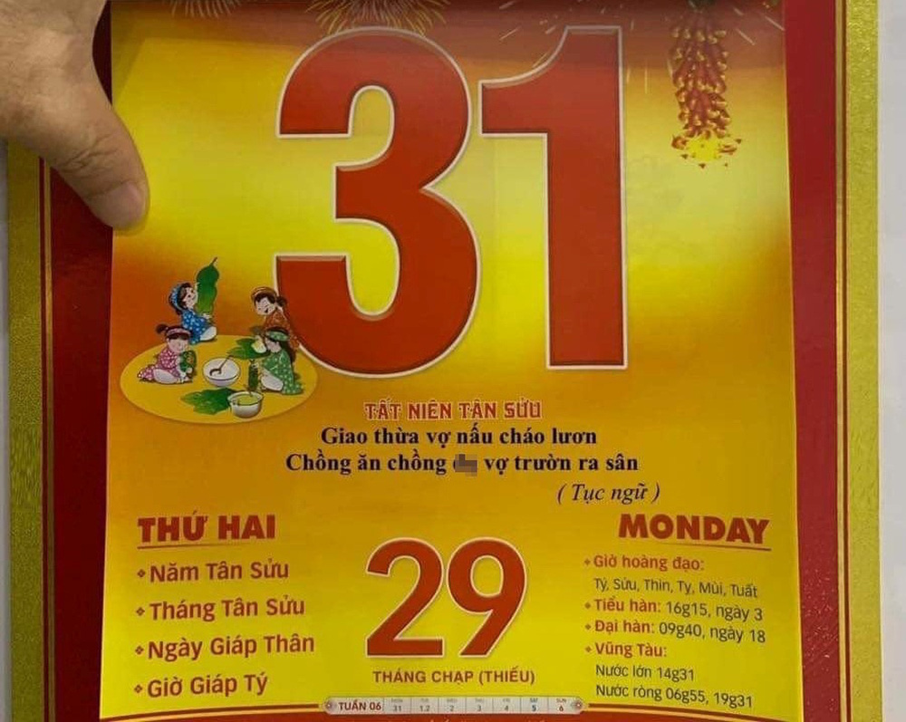 Mạng xã hội mới đây đã lan truyền hình ảnh một tờ lịch Giao thừa Nhâm Dần 2022, trong đó có câu viết được chú thích rõ là tục ngữ: "Giao thừa vợ nấu cháo lươn/Chồng ăn chồng..., vợ trườn ra sân" khiến nhiều người bất ngờ vì lần đầu tiên nghe và thắc mắc sao tục ngữ lại nhiều từ nhạy cảm đến thế?