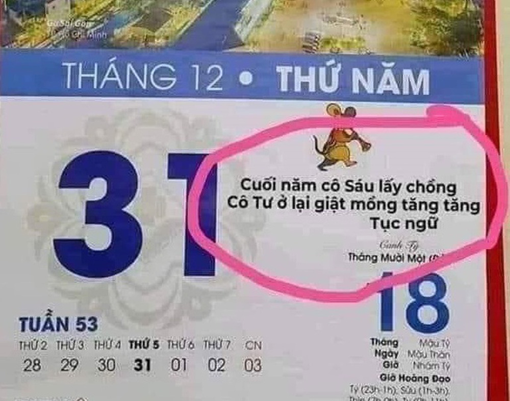 Trước đó, một số người dùng cũng chia sẻ tờ lịch của một doanh nghiệp in số lượng lớn tặng khách hàng, trong đó có trích dẫn câu được chú thích là ca dao tục ngữ: "Cô Ba cô Bốn lấy chồng/ Cô Năm ở lại giật mồng tăng tăng" với nội dung vô nghĩa, khó hiểu.