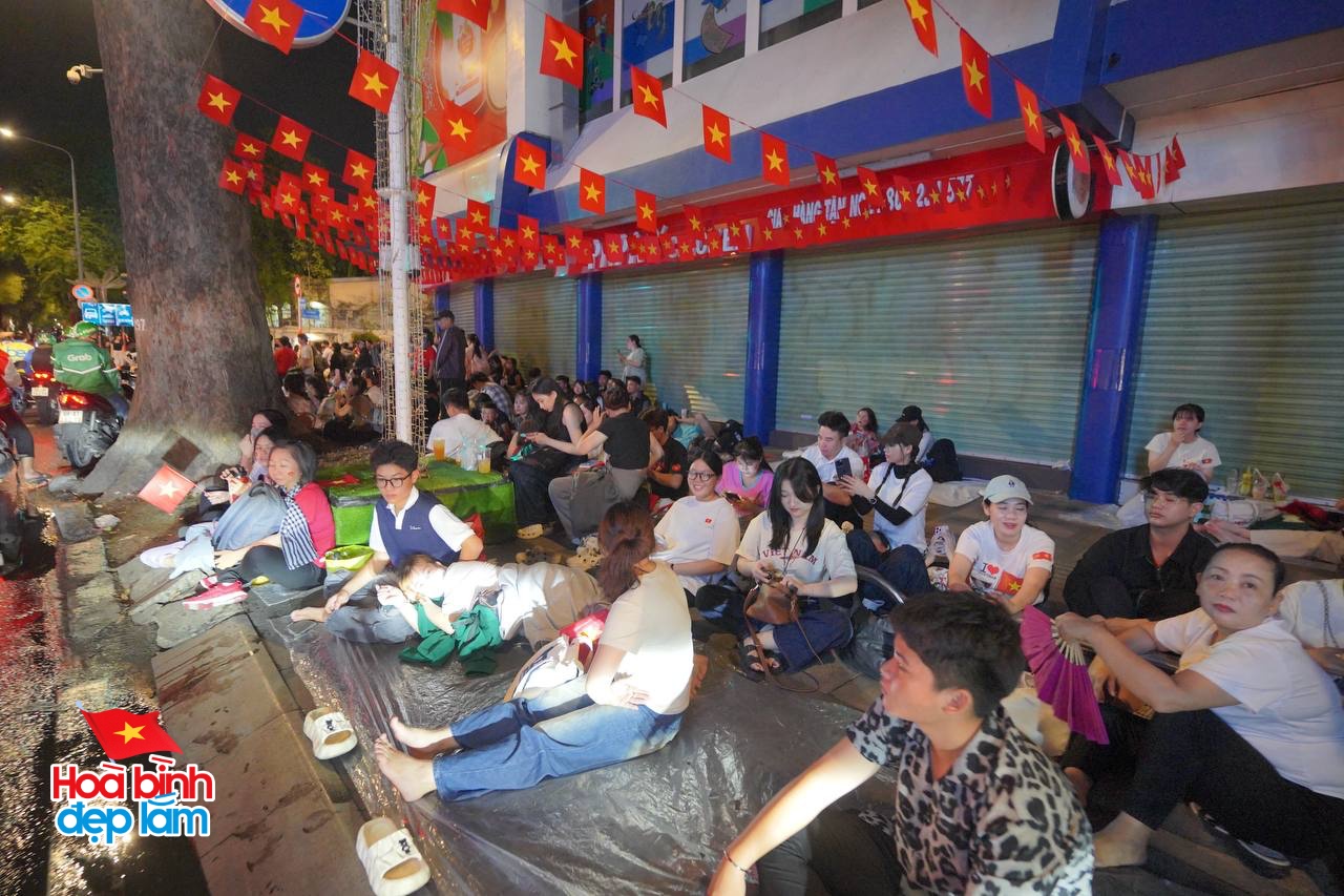 Sau khi xem pháo hoa, hàng trăm người đã cùng nhau trải bạt cùng nhau ngồi bên đường chờ đợi cho buổi tổng duyệt diễu binh, diễu hành diễn ra vào sáng hôm sau. Ảnh: Nghĩa Lê