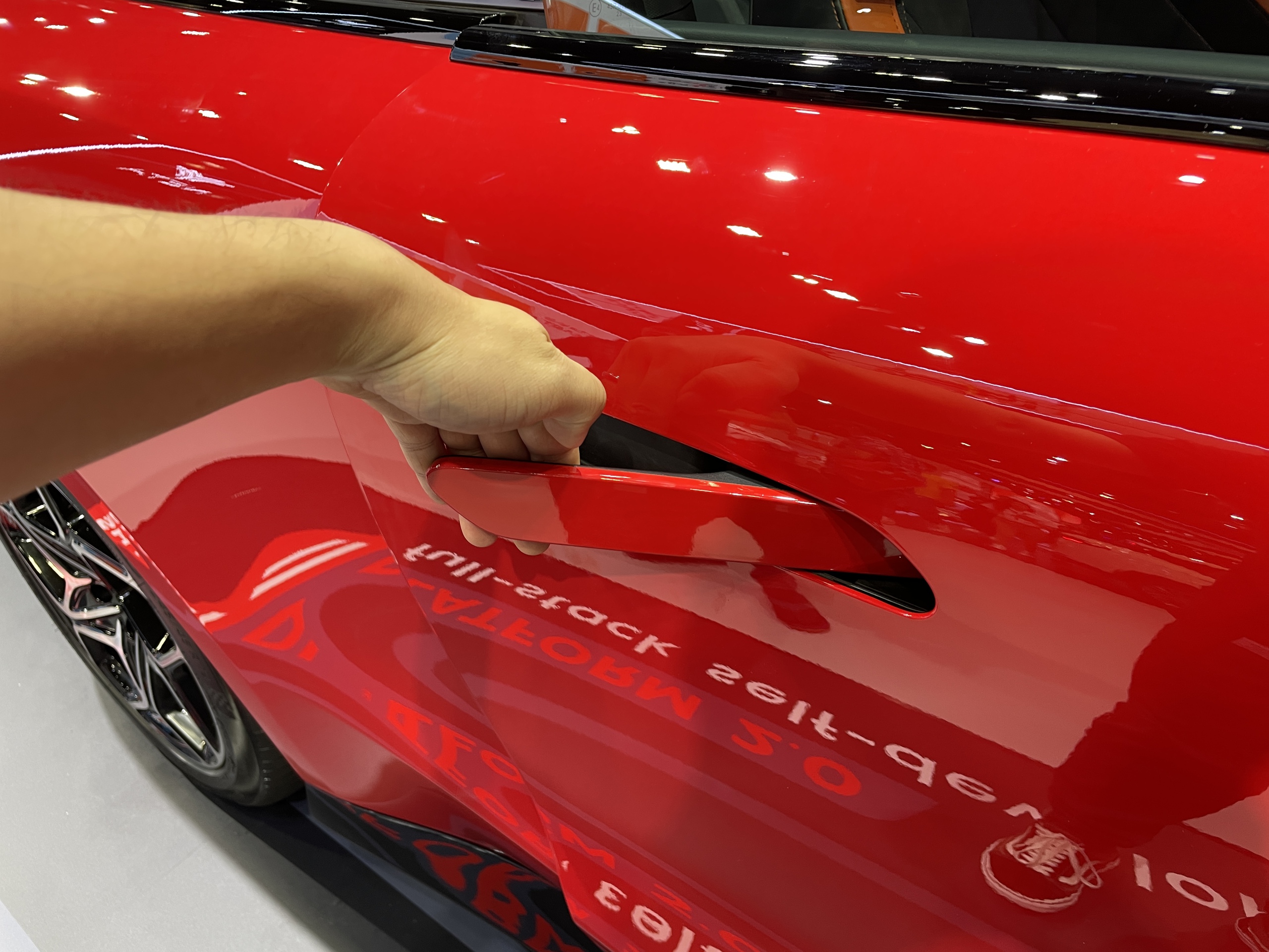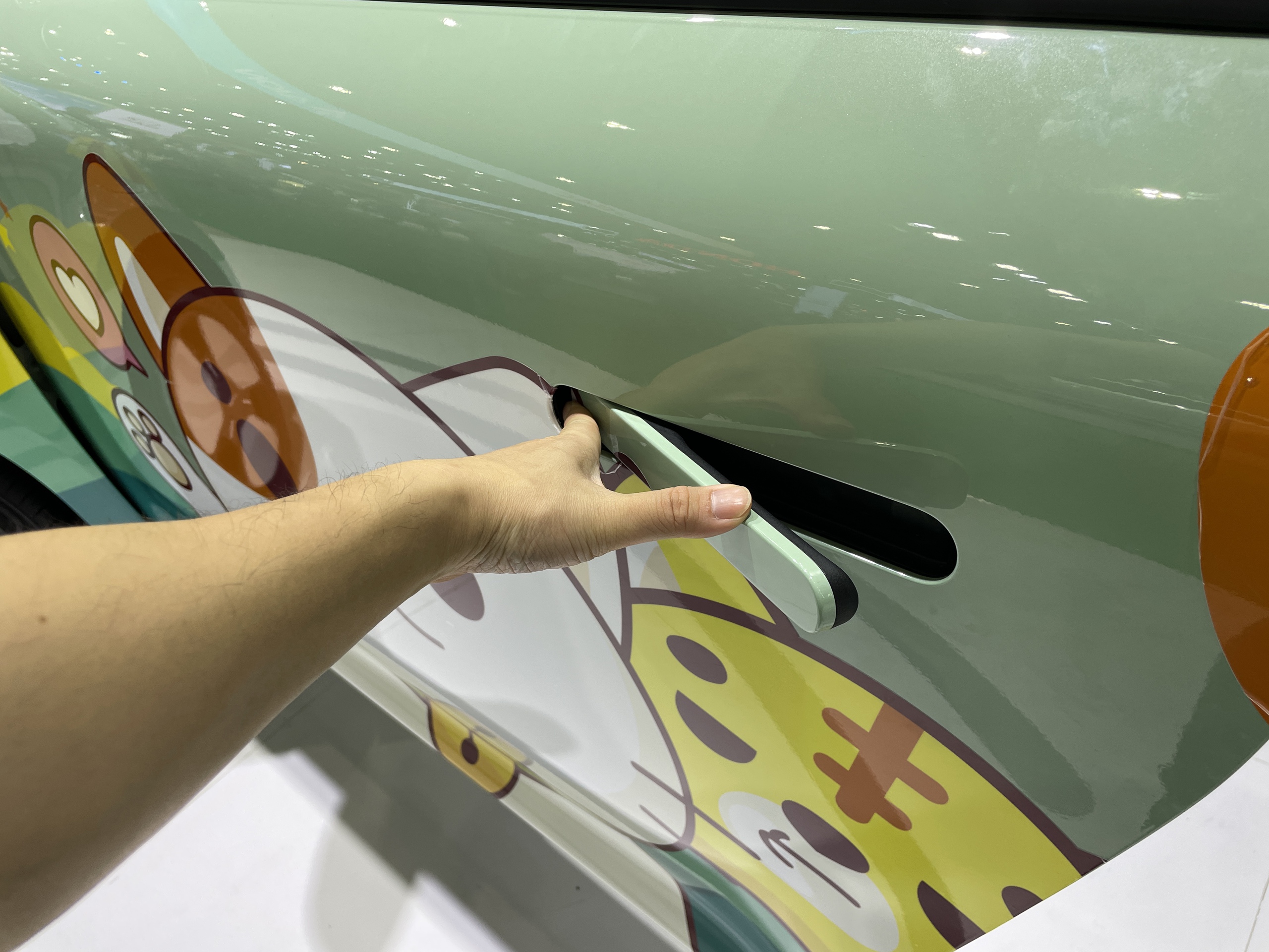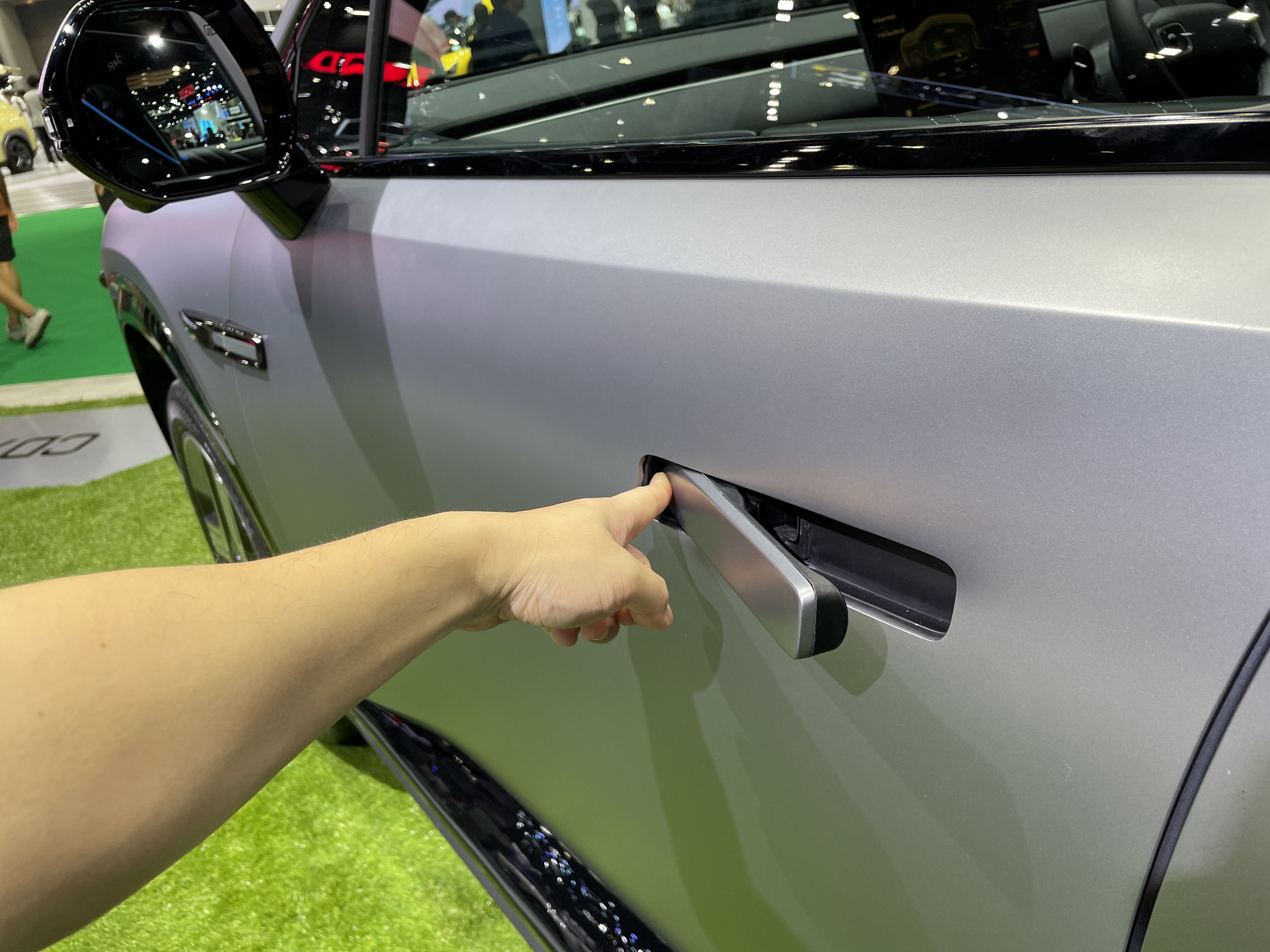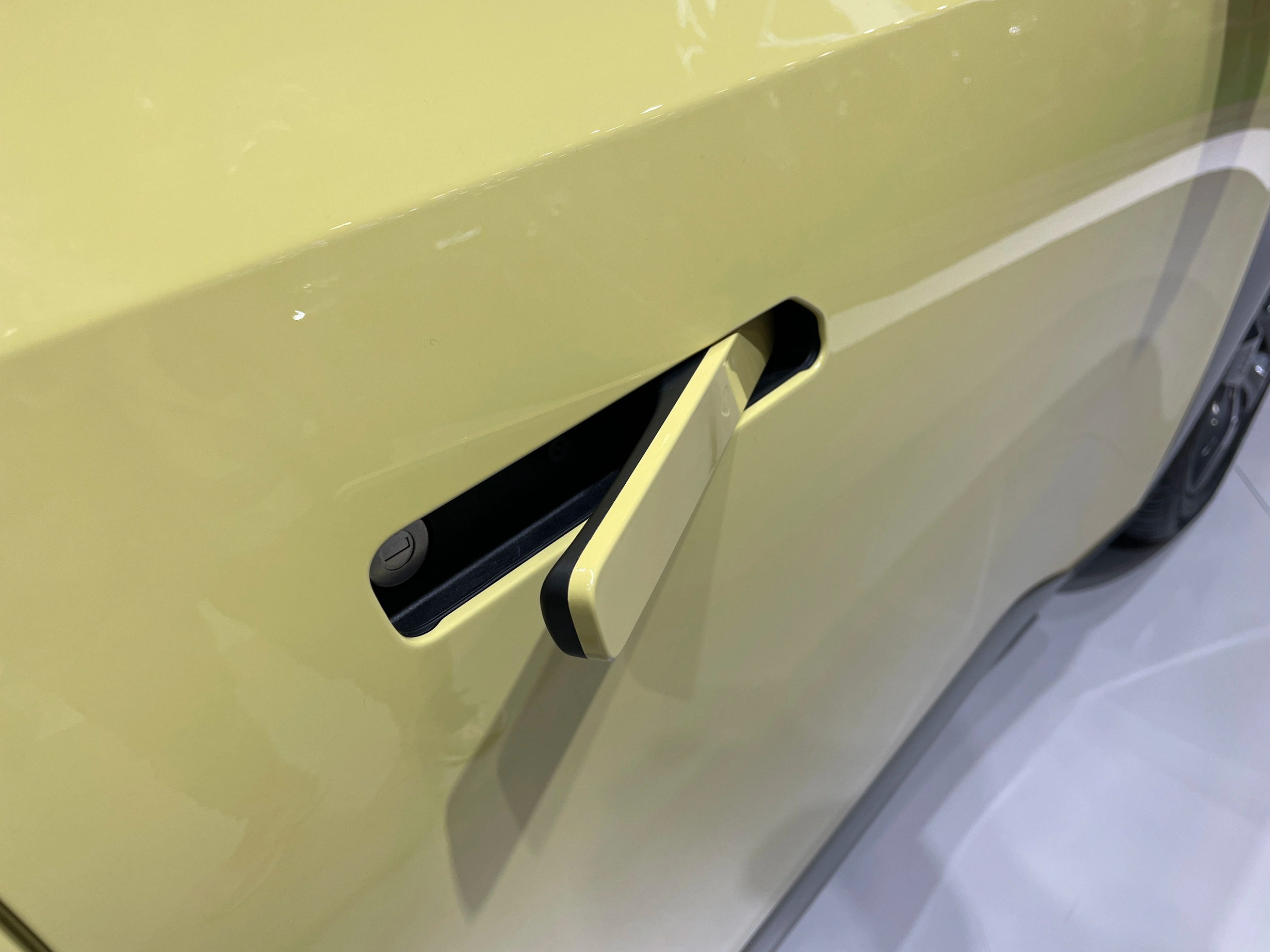 Mẫu tay nắm cửa dạng ẩn xuất hiện trên hầu hết các xe Trung Quốc được trưng bày tại sự kiện. Kiểu tay nắm này từng là đặc trưng trên các mẫu siêu xe, điển hình là Lamborghini Huracan. Chiếc xe trong hình ảnh dưới đây là Aion Y Plus. Có thể thấy thiết kế 2 loại tay nắm cửa gần giống hệt nhau.