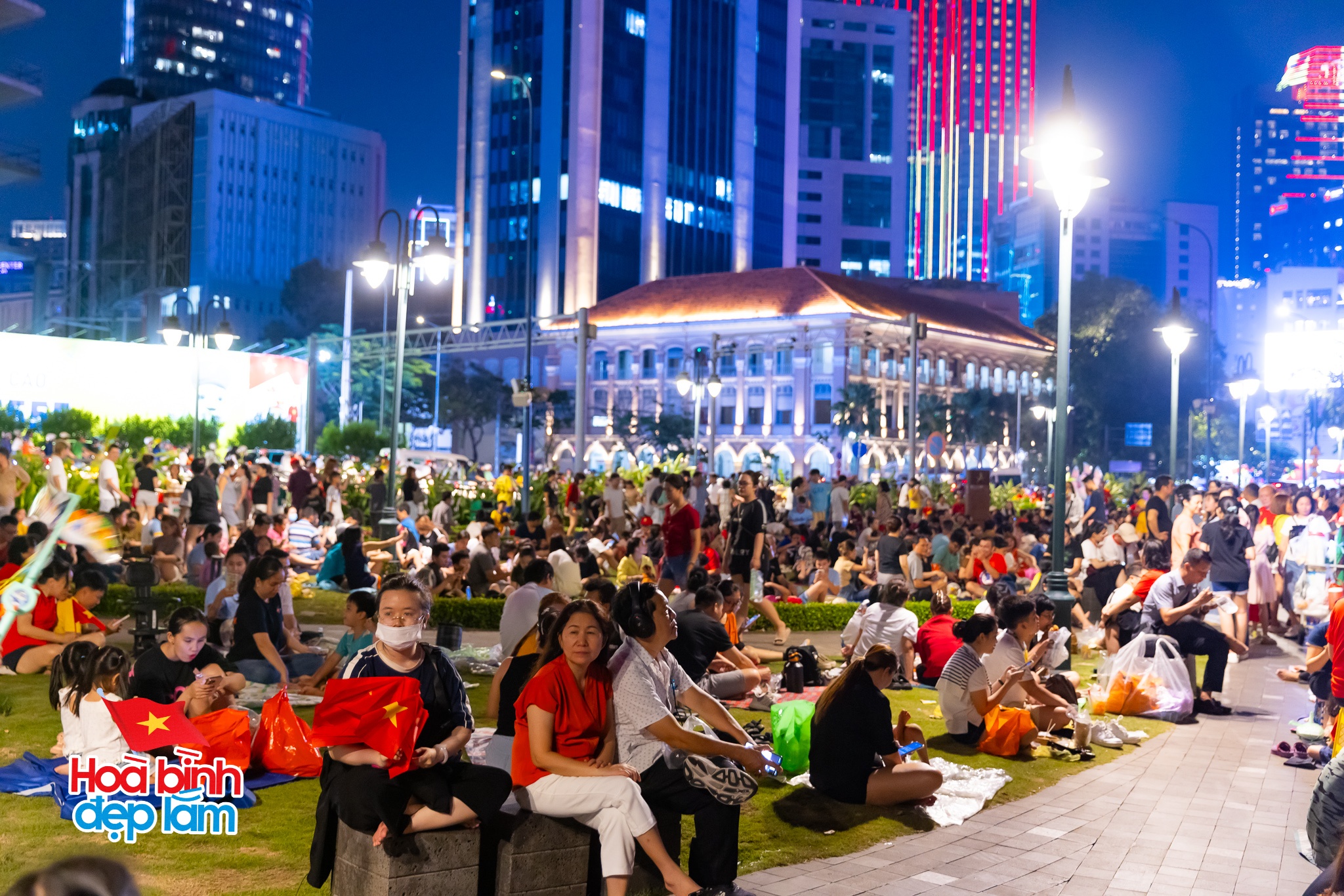 20h00, Hàng ngàn người dân TP.HCM đã đổ về khu vực trung tâm TP.HCM để chiêm ngưỡng màn trình diễn drone ánh sáng hoành tráng