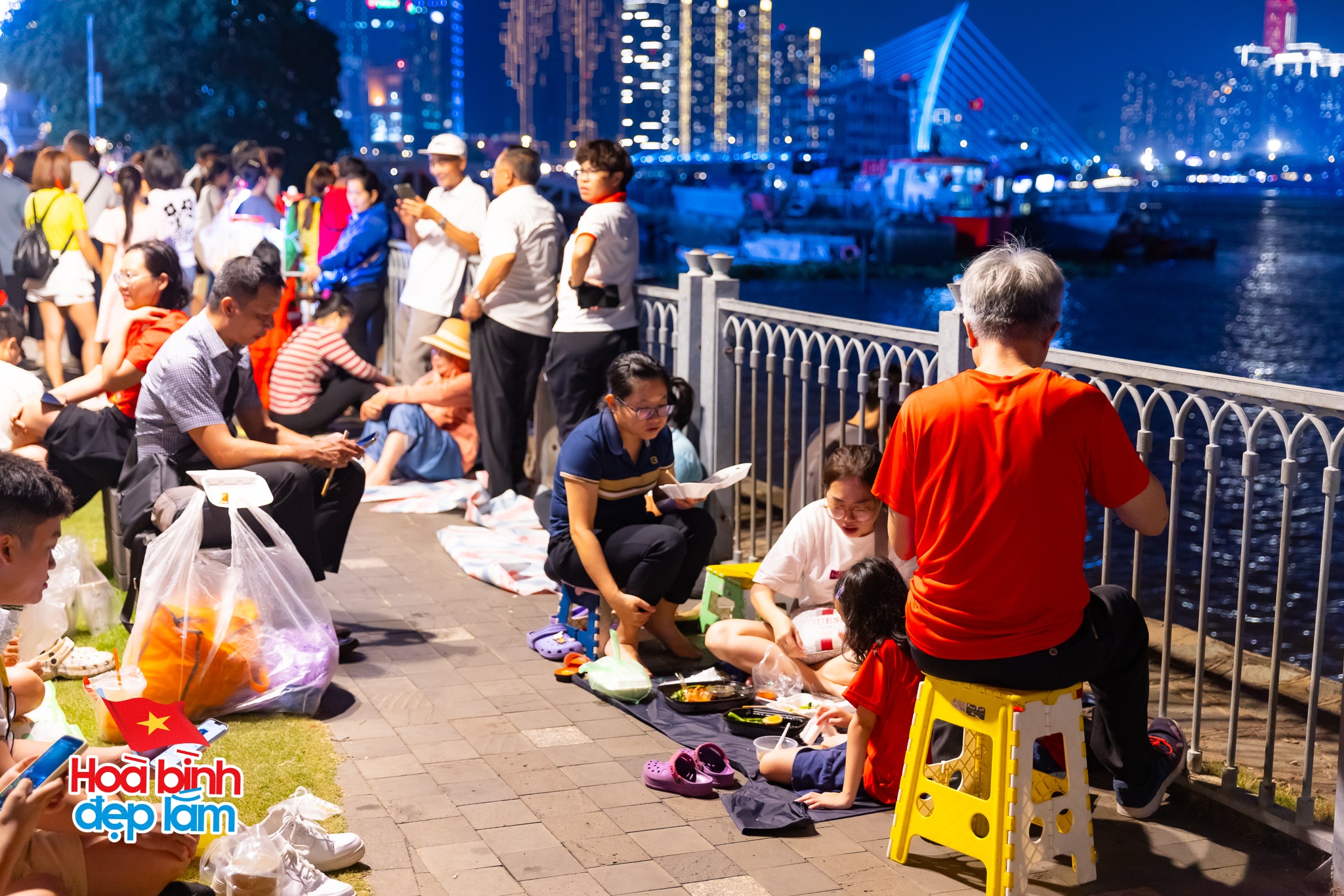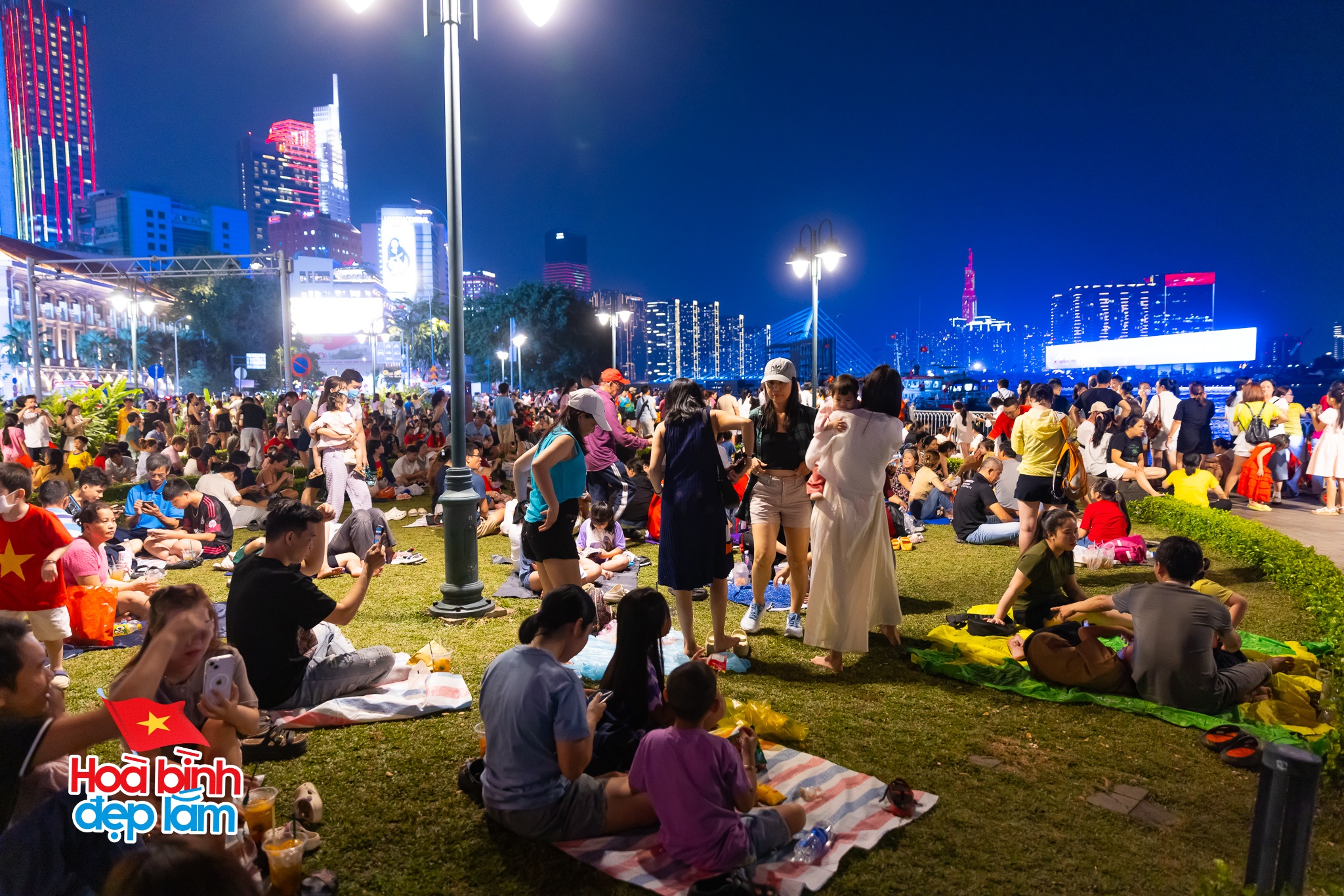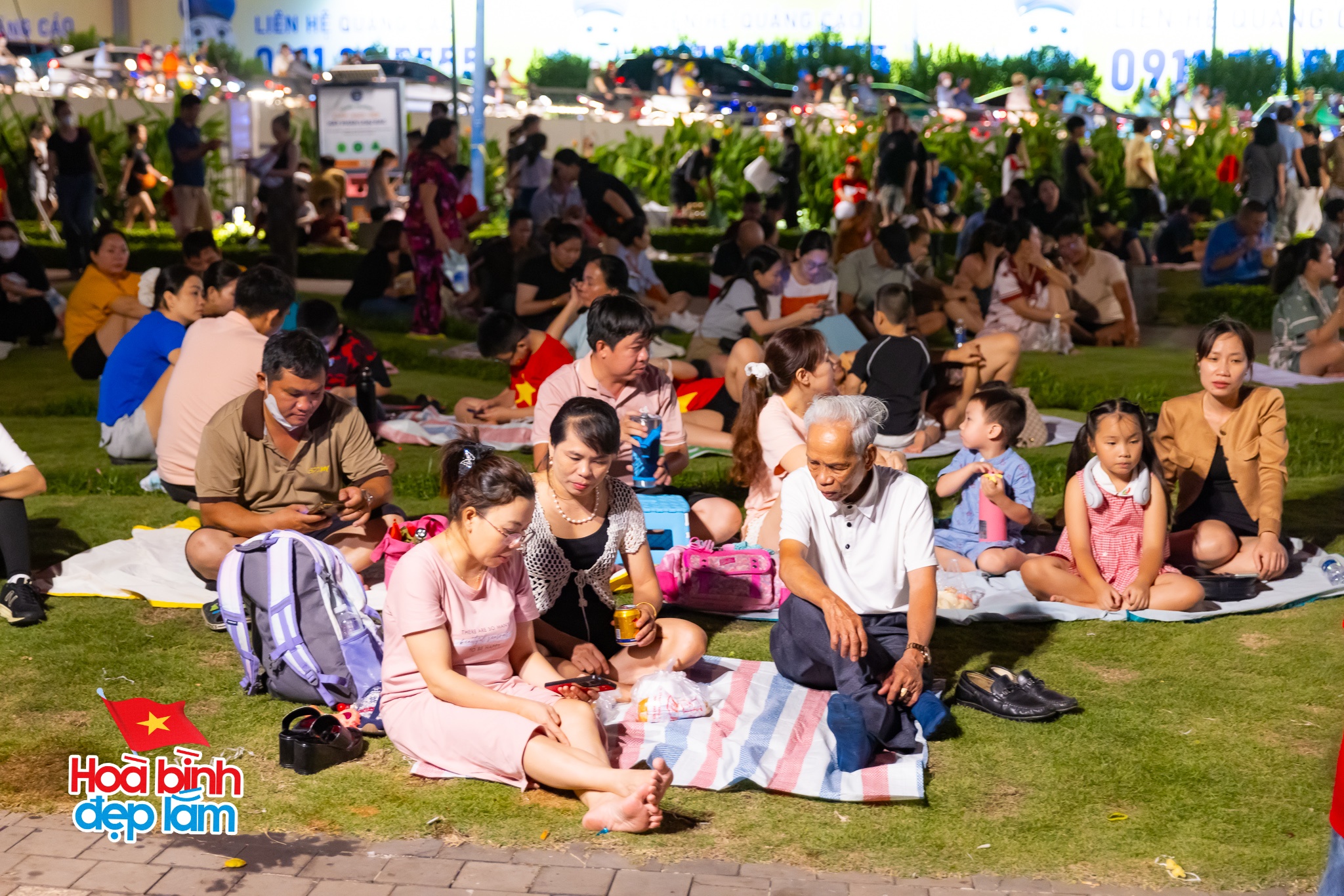 Nhiều gia đình chuẩn bị cả những tấm bạt nhỏ và đồ ăn nhẹ cùng nhau ngồi trên bãi cỏ trò chuyện rôm rả chờ đợi chiêm ngưỡng màn trình diễn drone ánh sáng hoành tráng