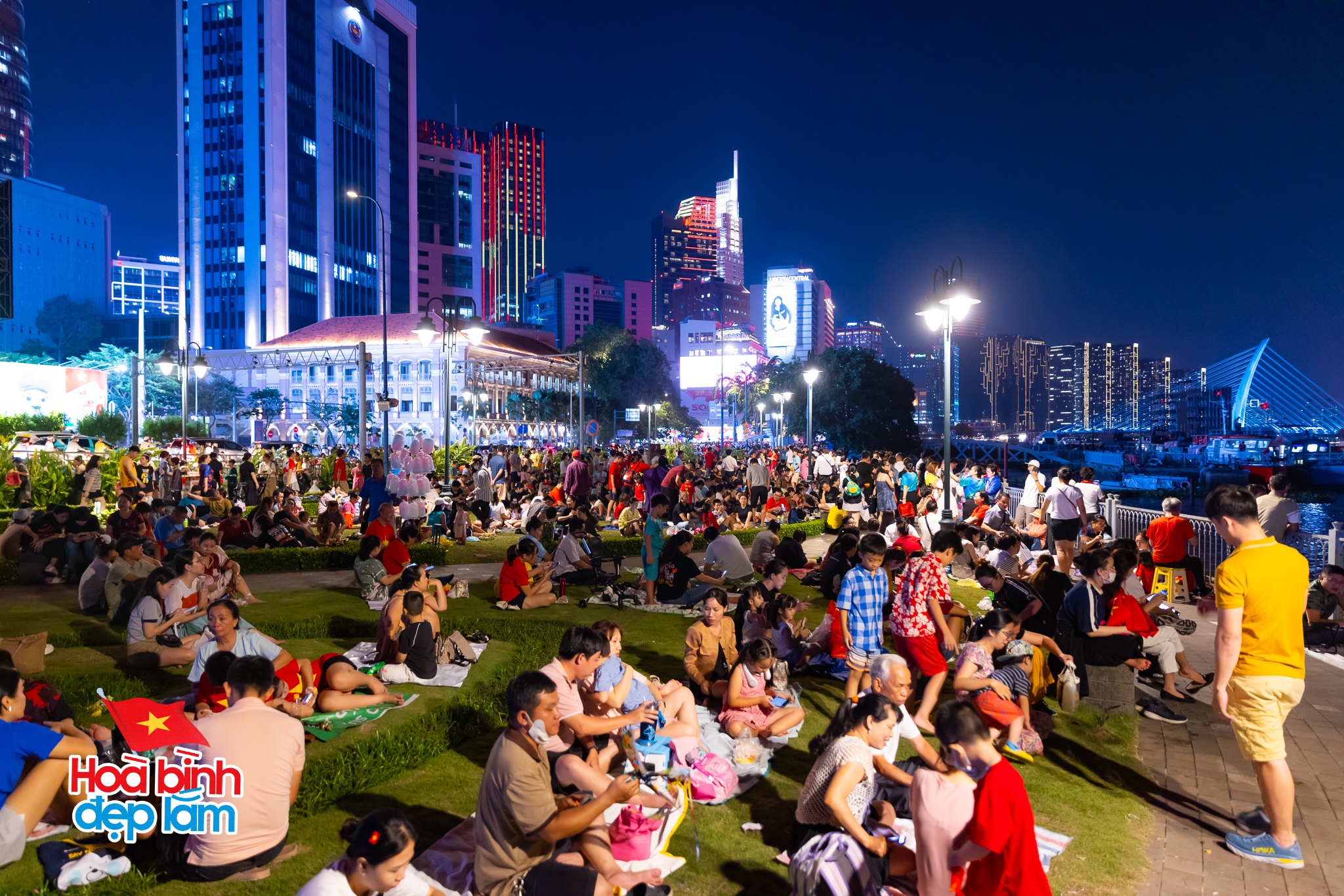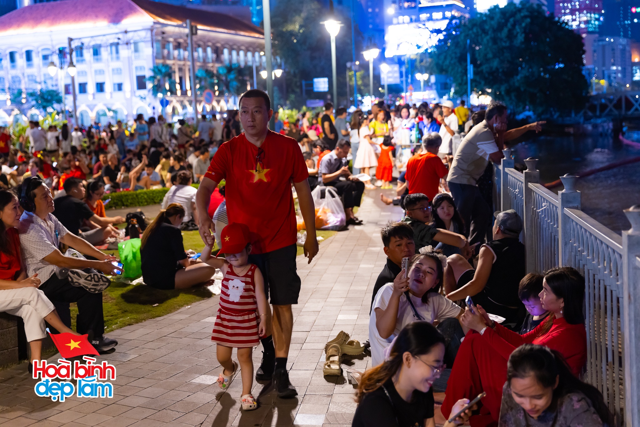 Nhièu gia đình dẫn theo con nhỏ đến khu vực bờ sông Sài Gòn để được chiêm ngưỡng màn trình diễn ánh sáng mãn nhãn
