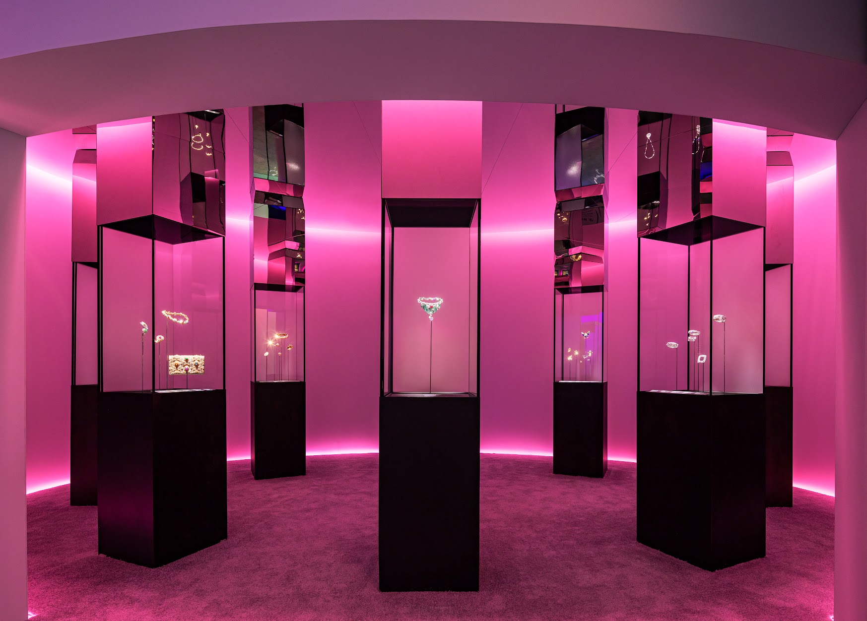 Các không gian được thiết kế làm nổi bật sự giao thoa của ngành kim hoàn với nhiều bộ môn nghệ thuật khác như thời trang, khiêu vũ và kiến trúc.