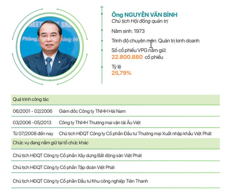VPG cũng công bố bổ nhiệm bà Lê Thị Thanh Lệ - vợ ông Bình, thành viên HĐQT, giữ chức Chủ tịch HĐQT công ty nhiệm kỳ 2022-2027 kể từ ngày 3/6. Bà Lê Thị Thanh Lệ cũng là người đại diện pháp luật của công ty.