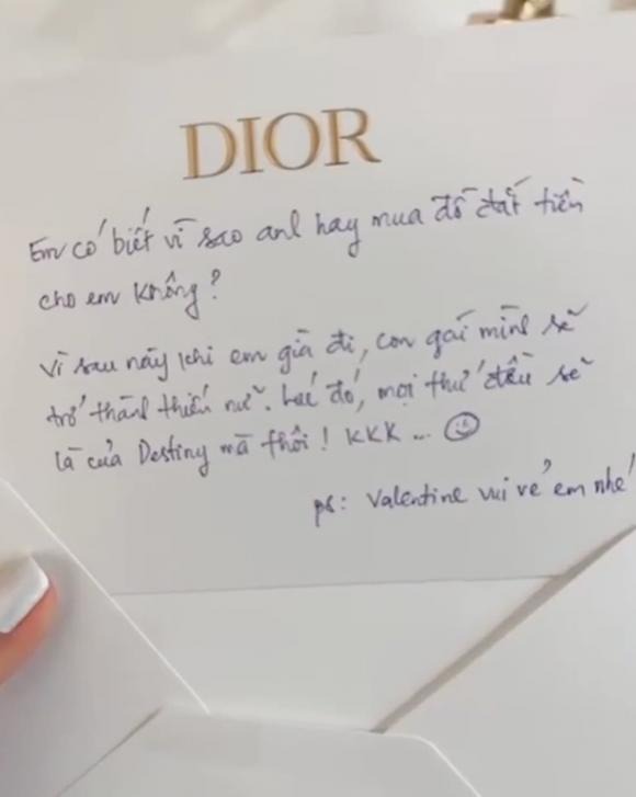 Ngay sau đó, món quà mà Trường Giang tặng Nhã Phương cuối cùng cũng được hiện diện. Đó là chiếc túi Layd Dior phiên bản hình chữ nhật màu trắng với phần khăn thắt đầy đủ. Đây là mẫu túi mới ra mắt có giá dao động từ 60-100 triệu. Nữ diễn viên liên tục reo vui khi ngắm món quà chồng tặng: "Destiny có thích món quà này không? Mẹ thích món quà này quá à".