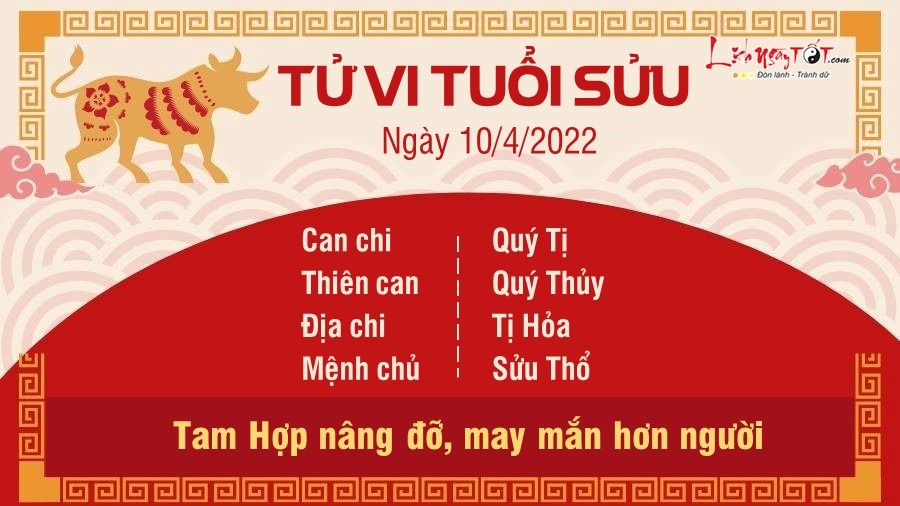 Hôm nay có Thiên Quan chiếu mệnh nên tuổi Sửu dễ gặp khó khăn trong công việc liên quan đến chức quyền, quan chức, có tiểu nhân tranh giành, cướp công. Dẫu biết rằng làm tốt thì không sợ ai nhưng đôi khi tránh được rắc rối cũng là điều nên làm. Đường tình cảm được Tam Hợp nâng đỡ nên con giáp này may mắn hơn người. Mặt ngoại giao tốt đẹp, được nhiều người yêu quý, luôn nở nụ cười thân thiện trên môi. Tình yêu thuận lợi, không có mâu thuẫn xảy ra. Chuyện tiền nong cũng may mắn không kém nhờ Hỏa sinh Thổ. Thời gian đã cho con giáp những bài học kinh nghiệm, biết đứng lên sau khi vấp ngã. Sẵn sàng đối mặt với khó khăn, nhờ vậy mà bản mệnh ngày càng trưởng thành hơn, khó bị lừa hơn.