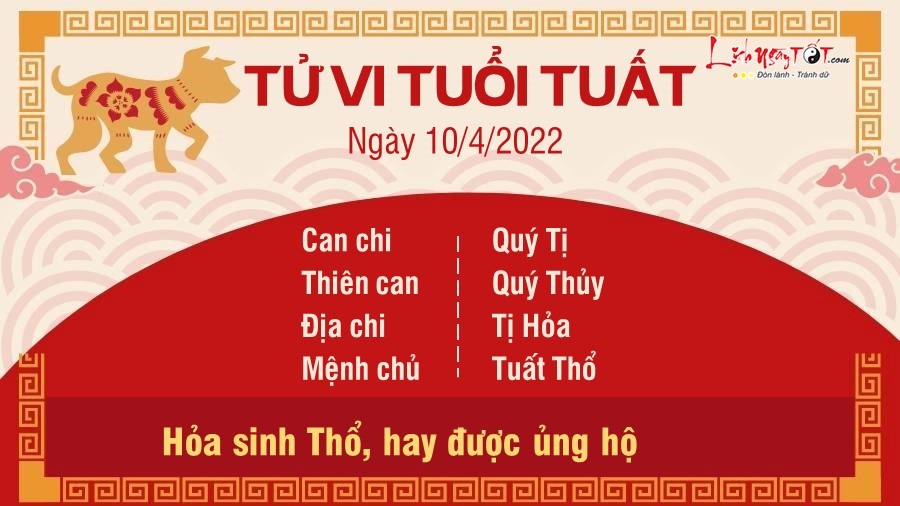 Ngày mới tuổi Tuất có Thiên Ấn chiếu mệnh, trong công việc có uy quyền, có tiếng nói. Tuy nhiên tuổi này có chút cứng nhắc, nghiêm nghị và kỷ cương nên công việc vẫn chưa thể phát triển được, đặc biệt là những bạn làm kinh doanh. Vận tình cảm là điểm sáng trong ngày nhờ Hỏa sinh Thổ. Con giáp này nhận được sự ủng hộ từ người thân và nửa kia nhiều hơn mọi ngày. Có đôi lúc hơi vất vả nhưng được mọi người động viên nên mệt mỏi tan biến hết. Đường tài lộc cũng may mắn không kém. Mỗi ngày, bạn nỗ lực hết sức không phải để theo đuổi giấc mơ vĩ đại nào đó, mà là để cuộc đời mình sau này không chỉ toàn hối hận.