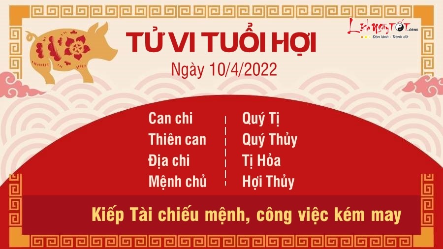 Chủ nhật này tuổi Hợi kém may vì Kiếp Tài chiếu mệnh. Đi làm hay ở nhà thì cũng khó yên ổn. Đặc biệt là những người làm cấp cao, hay bị cấp dưới nói xấu, gây khó dễ. Người làm tự do dễ bị tiểu nhân ghen ăn tức ở chèn ép. Đường tình cảm lâm Tương Xung nên dễ xảy ra mâu thuẫn, có điềm đào hoa xấu, tư tưởng ngoại tình. Người độc thân đã dành quá nhiều thời gian và sức lực cho công việc nên không còn nhiệt tình trong chuyện tìm kiếm người yêu nữa. Vận tài lộc vì Thủy khắc hỏa nên khá lao đao. Bạn không kiểm soát được chi tiêu mà vung tiền cho những khoản không cần thiết. Ra đường thì gặp rắc rối, về nhà cũng chẳng được yên nên tâm trạng tuổi này bí bách cùng cực.