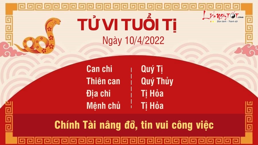 Tuổi Tị có Chính Tài nâng đỡ, tin vui trong công việc sắp đến với bạn rồi đó. Nhiều bạn tuổi Tị thời gian tới được cấp tin tín nhiệm, khen ngợi. Công sức cố gắng của bạn bao lâu nay cuối cùng cũng được người khác công nhận. Mặt tình cảm của tuổi Tị nhờ cục diện hai hành Hỏa tương hòa xoa dịu những mâu thuẫn cũ trong mọi mối quan hệ. Bạn hiền lành, không nóng nảy, nhân từ, là người hòa giải trong mọi mối quan hệ, ai ai cũng quý con giáp này. Tiền bạc tuy không được xuất sắc nhưng cũng tạm ổn, có lộc đều đều. Bạn không thiếu những cơ hội làm ăn bất ngờ, nếu nắm bắt được thông tin thì tiến hành ngay, đừng do dự.