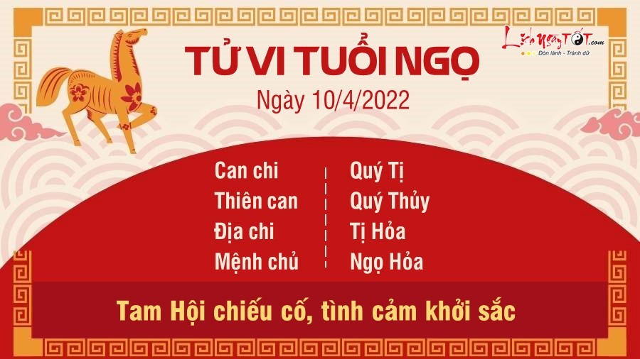 Ngày mới của tuổi Ngọ mặt công việc ảnh hưởng bởi Thiên Tài nên chỉ ở mức trung bình, chỉ có lợi cho những người đang làm thêm, có nghề tay trái hoặc làm nghề liên quan đến xổ số tài chính, hy vọng ngày sau Ngọ sẽ khởi sắc hơn. May mắn được Tam Hội chiếu cố nên tình cảm khởi sắc hơn nhiều. Đi đâu cũng có người quý mến, giúp đỡ. Số vất vả nhưng được cái hay có người mến nên đỡ hơn rất nhiều. Chuyện tình cảm cũng êm xuôi và không có gì khúc mắc. Mặt tài lộc nhờ cục diện hai hành Hỏa tương hòa nên rất ổn định. Bạn không phải mất tiền oan hay chi quá nhiều tiền trong ngày nghỉ này. Những khoản chi trong hôm nay cực kỳ hợp lý.