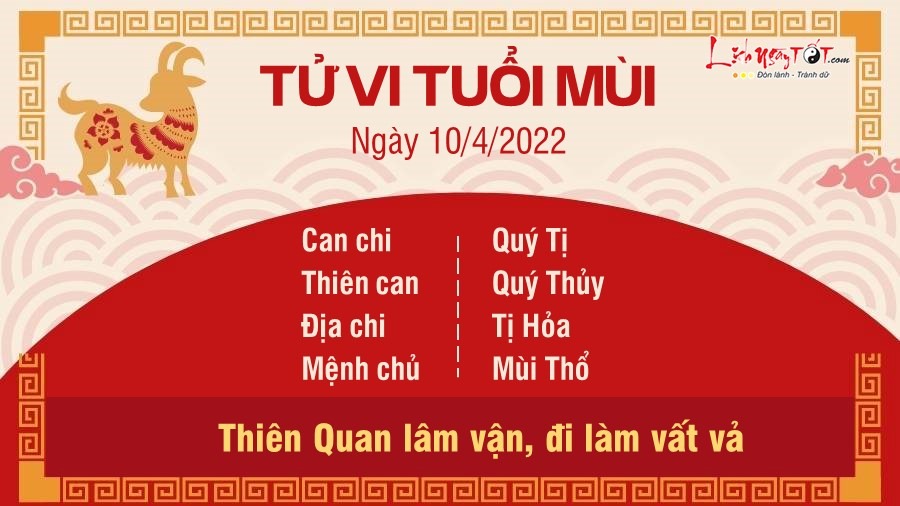 Hôm nay tuổi Mùi chịu tác động từ Thiên Quan nên đi làm khá vất vả, cứ nghỉ ngơi thì không sao nhưng đi làm lại có chuyện. Bạn muốn yên ổn nhưng tiểu nhân thích sân si, ghen ghét, đặt điều để bôi nhọ bạn. Là con giáp có chí tiến thủ năm 2022, tử tin tin rằng Mùi sẽ đánh gục những người có ý đồ xấu. Mặt tình cảm may mắn nhờ Tam Hội tương trợ nên cứu vớt lại tâm trạng của Mùi. Người độc thân có thể sẽ tìm thấy một nửa cuộc đời, điều duy nhất bạn cần làm là tự tin và cởi mở hơn trong các mối quan hệ. Đường tài lộc nhờ Hỏa sinh Thổ nên rất may mắn. Tài chính hôm nay cho phép bạn có thể tổ chức một bữa tiệc nhỏ để gắn kết các thành viên trong gia đình, ngày nghỉ nên cứ thoải mái đi nhé.