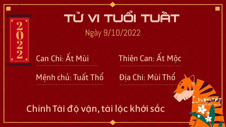 Tương Phá lâm vận cảnh báo tuổi Tuất gặp khó khăn trong công việc, có vẻ như có người đang cố tình phá hoại đường làm ăn của bạn. May mắn là tài lộc vẫn khởi sắc nhờ Chính Tài tinh độ vận, bản mệnh có thêm khoản thu nhập trong ngày. Tài chính đương lúc dư dả nên đừng quên dành ra một khoản tiết kiệm đảm bảo cho tương lai, đừng tiêu xài hoang phí. Đường tình cảm bình ổn, không có khúc mắc gì lớn nhờ hai hành Thổ tương hòa.