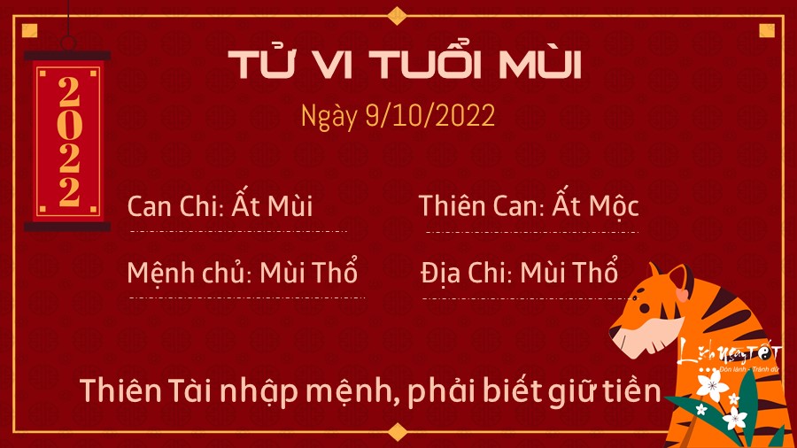Hôm nay Thiên Tài nhập mệnh có lợi cho những bạn tuổi Mùi đang kinh doanh tự do, có nghề tay trái hoặc có doanh nghiệp riêng. Tiền bạc là vật ngoài thân, mất rồi có thể kiếm lại, Mùi không quá quan trọng hóa vấn đề tiền nong, đầu óc thoải mái. Chính vì tính tình xởi lởi nên con giáp này dễ có lộc, dễ trúng thưởng hoặc phát tài nhanh. Vận trình tình duyên của bản mệnh trong ngày hôm nay ở mức bình thường do hai hành Thổ tương hòa.