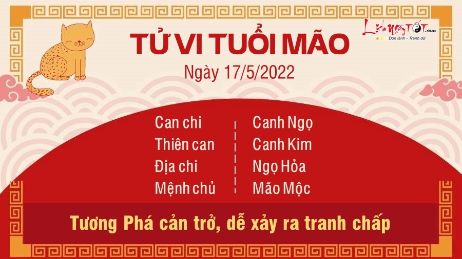 Tuổi Mão có điềm báo có thể xảy ra tranh chấp với người khác về quyền lực do Tương Phá cản trở. Bạn là người tham vọng nhưng chưa biết thể hiện một cách khéo léo nên vô tình làm mích lòng người khác, khiến đối phương có cái nhìn không thiện cảm mà bỏ qua năng lực thực sự của bạn. Chẳng những vậy, một vài kế hoạch buôn bán kinh doanh của bản mệnh trong ngày này còn vấp phải những chiêu trò cạnh tranh không lành mạnh từ đối thủ. Dù đã có sự chuẩn bị trước cho những tình huống tương tự nhưng lợi nhuận của bạn vẫn bị ảnh hưởng ít nhiều. Ngũ hành sinh xuất cũng phần nào tác động lên chuyện tình cảm vốn đã đầy rẫy rối ren của con giáp này. Mối quan hệ của bạn và nửa kia ngày càng căng thẳng khi mâu thuẫn mới cũ chồng chất nhưng chẳng được giải quyết một cách ổn thỏa.