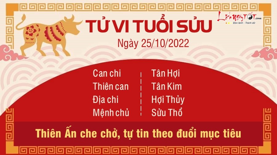 Thiên Ấn mang tới cho tuổi Sửu sự tự tin để theo đuổi mục tiêu của mình trong ngày hôm nay. Mọi kế hoạch của con giáp này đều diễn ra trôi chảy. Dù làm gì thì Sửu cũng thu được thành tựu đáng kể, giữ vững phong độ của mình trong tập thể. Với những biểu hiện trong thời gian qua, đặc biệt là tinh thần làm việc hết mình cùng những cống hiến to lớn dành cho công việc, bản mệnh được cấp trên đánh giá cao. Có lẽ thời cơ chuyển mình, thăng quan tiến chức của con giáp này đã ở rất gần rồi, vì thế cần phải nhanh chóng nắm bắt. Tuy nhiên, Thủy – Thổ xung khắc gây khó khăn cho Sửu trong vấn đề tình cảm. Các cặp đôi liên tục cãi vã vì nhiều vấn đề, dẫn đến những mâu thuẫn khó có thể xoa dịu được. Cũng vì nguyên nhân này mà khoảng cách giữa hai người càng ngày càng lớn hơn.