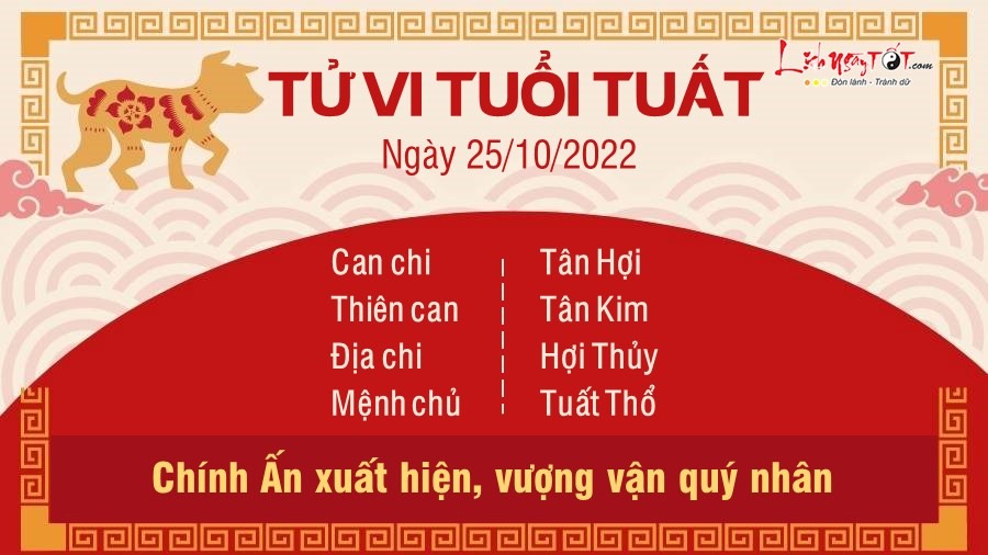 Tuổi Tuất được Chính Ấn che chở nên có vận quý nhân khá vượng. Quý nhân mang tới may mắn trên con đường công danh sự nghiệp của Tuất. Cát khí trong ngày khá vượng và thích hợp để cho con giáp này muốn khởi nghiệp hoặc mở rộng quy mô kinh doanh, buôn bán hoặc chuyển đổi công việc mới sẽ rất thuận lợi, suôn sẻ. Bản mệnh cho thấy sự tự tin và quyết đoán cũng như ý tưởng, kế hoạch để phát triển sự nghiệp. Mọi việc đều được bạn tiến hành theo kế hoạch cụ thể chứ không phải quyết định bồng bột nhất thời. Điều này giúp bạn có sự chuẩn bị kĩ càng, tính toán cả những rủi ro có thể gặp phải. Trái lại đường tình duyên khá kém sắc. Ngũ hành xung khắc cảnh báo những mâu thuẫn giữa hai người có thể khiến cho mối quan hệ càng ngày càng trở nên lạnh nhạt. Con giáp này không biết phải làm thế nào để cứu vãn tình cảm hiện tại. Người độc thân cần phải mở lòng mình hơn để đón nhận tình yêu.