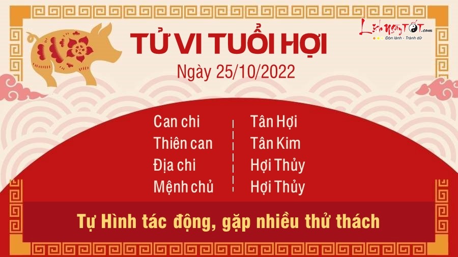 Ngày Hợi – Hợi Tự Hình, người tuổi Hợi có thể sẽ gặp chút thử thách trong công việc, tuy nhiên nếu vượt qua được trở ngại lần này bản mệnh sẽ rút ra được nhiều bài học, kinh nghiệm đáng quý cho mình và có nhiều bước tiến mới trong tương lai. Hãy coi đó như một cơ hội để rèn giũa bản lĩnh của mình. Về phương diện tài lộc, con giáp này cũng nên chú ý hơn tới chuyện chi tiêu của mình. Bạn cứ nghĩ thu nhập ổn định nên đã phung phí tùy hứng trong suốt thời gian vừa qua. Hãy tiết kiệm hết mức có thể vì trong tương lai còn nhiều việc phải dùng đến tiền nữa đấy. Ngũ hành Thủy vượng cũng khiến cơ thể mệt mỏi hơn, con giáp này nên quan tâm tới sức khỏe của mình. Dù bận rộn đến đâu cũng chớ nên bỏ bê cơ thể, sức khỏe một khi đã mất thì rất khó lấy lại được. Bản mệnh nên có chế độ tập luyện hàng ngày dù bận rộn tới cỡ nào.