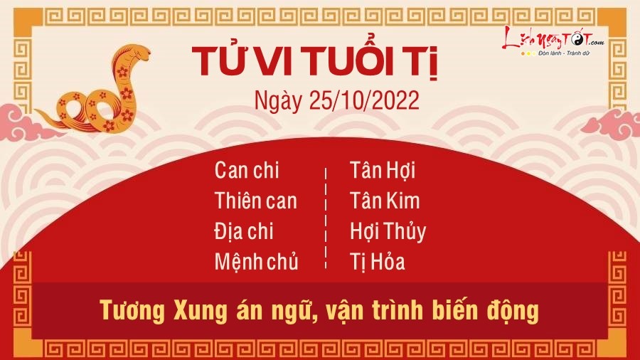 Chịu ảnh hưởng của cục diện Tương Xung, vận trình của người tuổi Tị có khá nhiều biến động. Điềm báo có tiểu nhân phá hoại, bạn cần hết sức lưu ý để không rơi vào những cái bẫy mà người này cố tình bày ra. Bạn có tài nhưng đôi khi làm việc quá chủ quan, tin vào nhận định của mình mà bỏ qua những rủi ro tiềm ẩn, chính điều đó khiến bạn dễ bị tiểu nhân nắm thóp. Các mối quan hệ xã hội của bản mệnh cũng không mấy hòa hợp. Bạn có thể gặp phải những kẻ xu nịnh, tiếp cận mình với ý đồ lợi dụng hòng đạt được một mục đích nào đó. Chính vì vậy, bạn cần phải luôn giữ vững lý trí của mình, biết phân biệt ai là người tốt, kẻ xấu để không rơi vào tròng của kẻ tiểu nhân. Thủy – Hỏa bất dung, vận trình tình duyên kém sắc, người độc thân dù rất cố gắng nhưng mãi vẫn chưa thoát được tình cảnh cô đơn, lẻ loi bởi chưa tìm được người thực sự ưng ý với mình. Tình yêu chưa tới cũng đừng quá lo lắng. Thay vào đó, bạn nên dành thời gian hoàn thiện và yêu thương bản thân nhiều hơn.