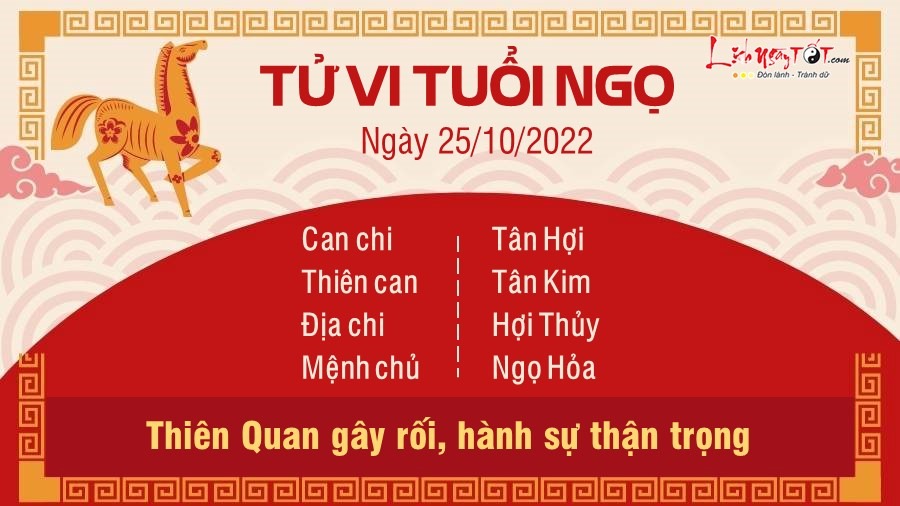 Đụng độ hung tinh Thiên Quan, người tuổi Ngọ được nhắc nhở nên thận trọng khi tiến hành bất cứ công việc hay triển khai kế hoạch nào trong hôm nay. Điềm báo tử vi cho thấy có người đang đố kỵ với thành công của bạn nên bày mưu ném đá giấu tay, quấy phá hoặc chiếm đoạt để bản mệnh không được hưởng thành quả xứng đáng. Ngoài ra con giáp này cũng có thể gặp phải sự cố trong chuyện làm ăn, thất thoát tiền bạc vì kế hoạch hợp tác đổ bể bất ngờ. Đối tác thay đổi ý định vào phút chót khiến bạn không kịp trở tay. Song nghĩ đi nghĩ lại thì đó rất có thể là âm mưu của kẻ tiểu nhân đã đặt ra từ trước đó, vì vậy đừng quá tin tưởng vào bất cứ ai. Ngũ hành tương xung khiến đường tình duyên gặp nhiều trắc trở. Tuổi Ngọ những tưởng mình đã gặp đúng người vào đúng thời điểm, tìm thấy hạnh phúc cho riêng mình nhưng cuối cùng mọi thứ không đơn giản như thế, hạnh phúc có thể tuột khỏi tay bất cứ lúc nào.