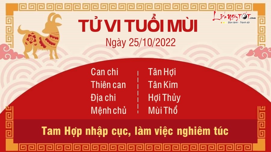 Cục diện Tam Hợp xuất hiện, tuổi Mùi cho thấy tình yêu và sự nghiêm túc với công việc hiện tại. Bạn rất xông xáo đưa ra những ý tưởng mới mẻ, độc đáo nhằm phát triển công việc ngày càng tốt hơn. Bạn sở hữu nguồn năng lượng dồi dào và đó chính là yếu tố giúp bạn tỏa sáng, được đồng nghiệp, cộng sự tin tưởng. Tình hình tài chính tương đối ổn định, các nguồn thu nhập đảm bảo cho con giáp này không phải lo nghĩ quá nhiều về việc chi tiêu hay theo đuổi mục tiêu của mình. Dù vậy, bạn vẫn cần phải mua sắm hợp lí, tránh vung tay quá trán chỉ vì sở thích của bản thân. Hãy học cách tiết kiệm cho trong tương lai ngay từ bây giờ. Tuy nhiên, do ngũ hành xung khắc nên chuyện tình cảm xuất hiện vết nứt do mâu mâu giữa các cặp đôi ngày càng diễn ra thường xuyên hơn. Nguyên nhân có thể cũng bởi hai người không có nhiều thời gian ở bên nhau khiến khoảng cách ngày một xa dần, tình yêu phai nhạt.