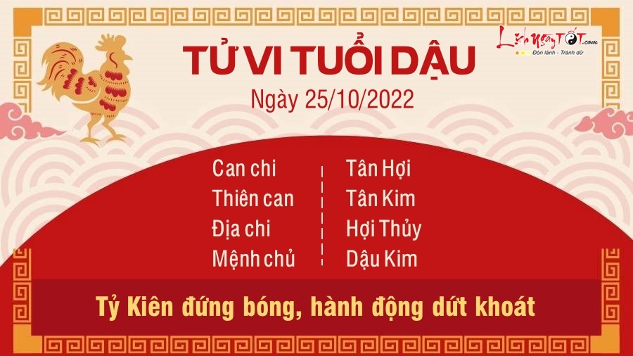 Tỷ Kiên nhập cục giúp tuổi Dậu thêm phần quyết liệt hơn bao giờ hết để đạt được những mục tiêu trong công việc. Bạn hành động dứt khoát, tranh thủ tận dụng mọi cơ hội mình đang có sẵn. Dù vậy, trước khi đưa ra bất cứ quyết định nào bạn cũng phải suy nghĩ thật thấu đáo, tránh bốc đồng, nóng nảy mà hỏng việc. Đường tài lộc của con giáp này trong ngày tương đối ổn định, thu nhập đều đặn nên không phải lo lắng gì về chuyện tiền bạc. Tự tin về tài chính nên dẫu có gặp phải chuyện gì bạn cũng dễ dàng xoay sở hơn. Nhân lúc tiền bạc đang rủng rỉnh, bạn cũng nên có kế hoạch tiết kiệm để đề phòng những việc bất trắc xảy ra. Tuy nhiên, có thể người tuổi Dậu sẽ gặp phải một số vấn đề về tình cảm. Ngũ hành bản mệnh sinh xuất nên có thể con giáp này sẽ hơi thiếu kiên nhẫn khi giải quyết những khúc mắc giữa hai người, điều này cần có sự cố gắng và hợp tác của cả hai.