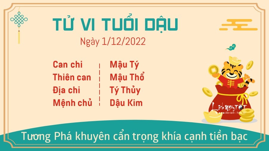Tý Dậu Tương Phá khuyên tuổi Dậu cẩn trọng khía cạnh tiền bạc. Bạn đang khởi nghiệp nên kiểm soát vốn đầu tư của bản thân, dù sao việc này không dễ dàng, đầu tư hết tiền đi thì bạn chẳng còn lại gì. Người tuổi Dậu gần như không muốn cho bất cứ ai cơ hội khi mà Thương Quan khiến bạn thiếu đi sự tin tưởng, bạn luôn lo ai đó "đâm sau lưng mình" và bạn cũng không nhận ra việc này đang kéo lùi bạn lại. Ngũ hành tương sinh bù đắp cho những muộn phiền của bản mệnh. Kể cả ốm đau cũng có người chia sẻ, thiếu tiền có người hỗ trợ. Hãy cảm ơn họ vì người ta luôn bên bạn, đừng vì những kẻ xấu mà muộn phiền quá lâu.